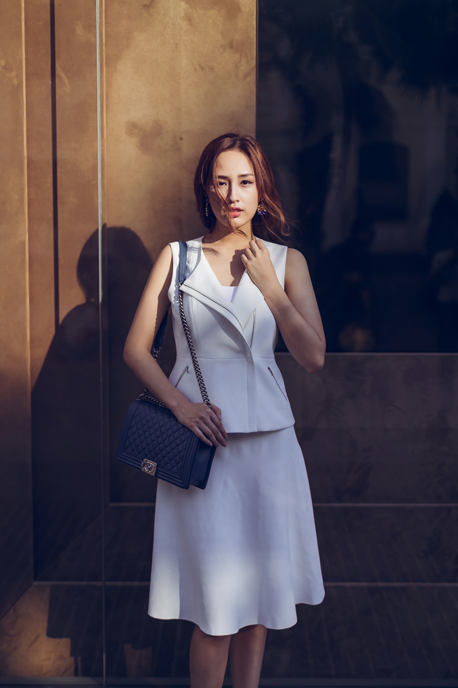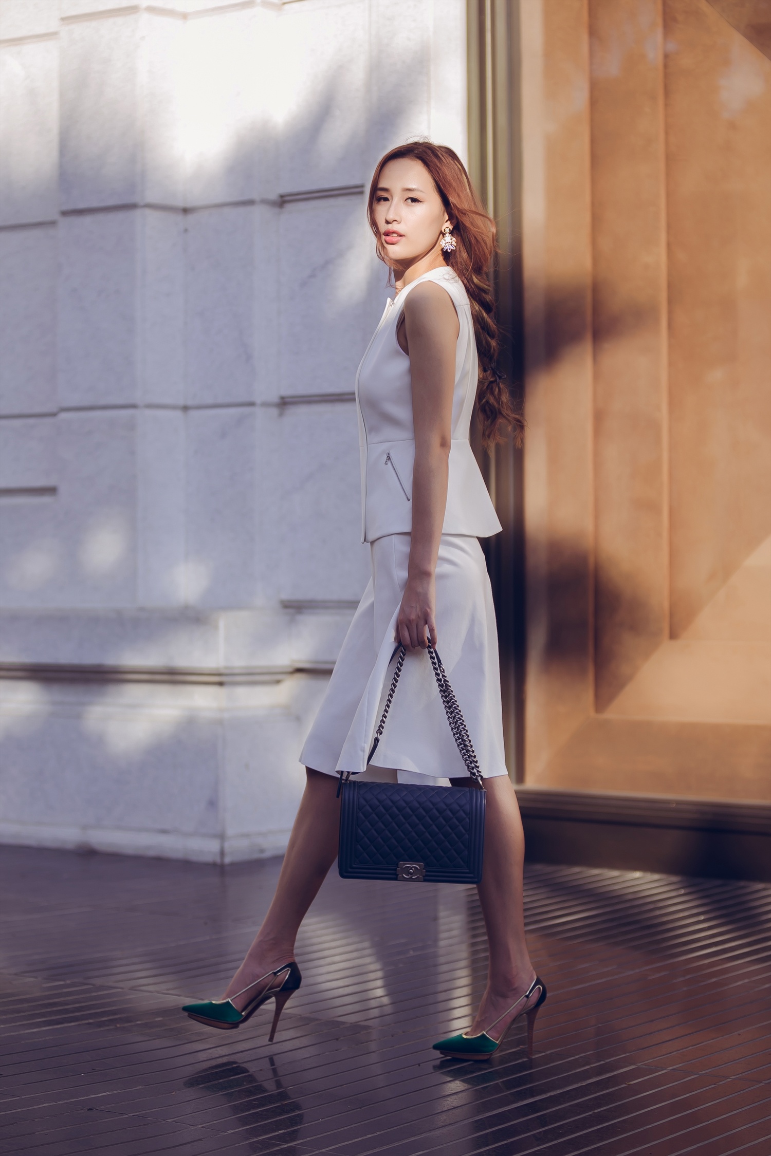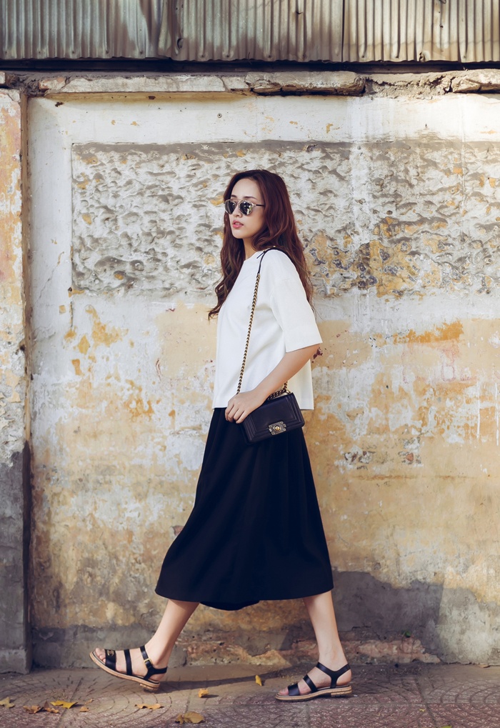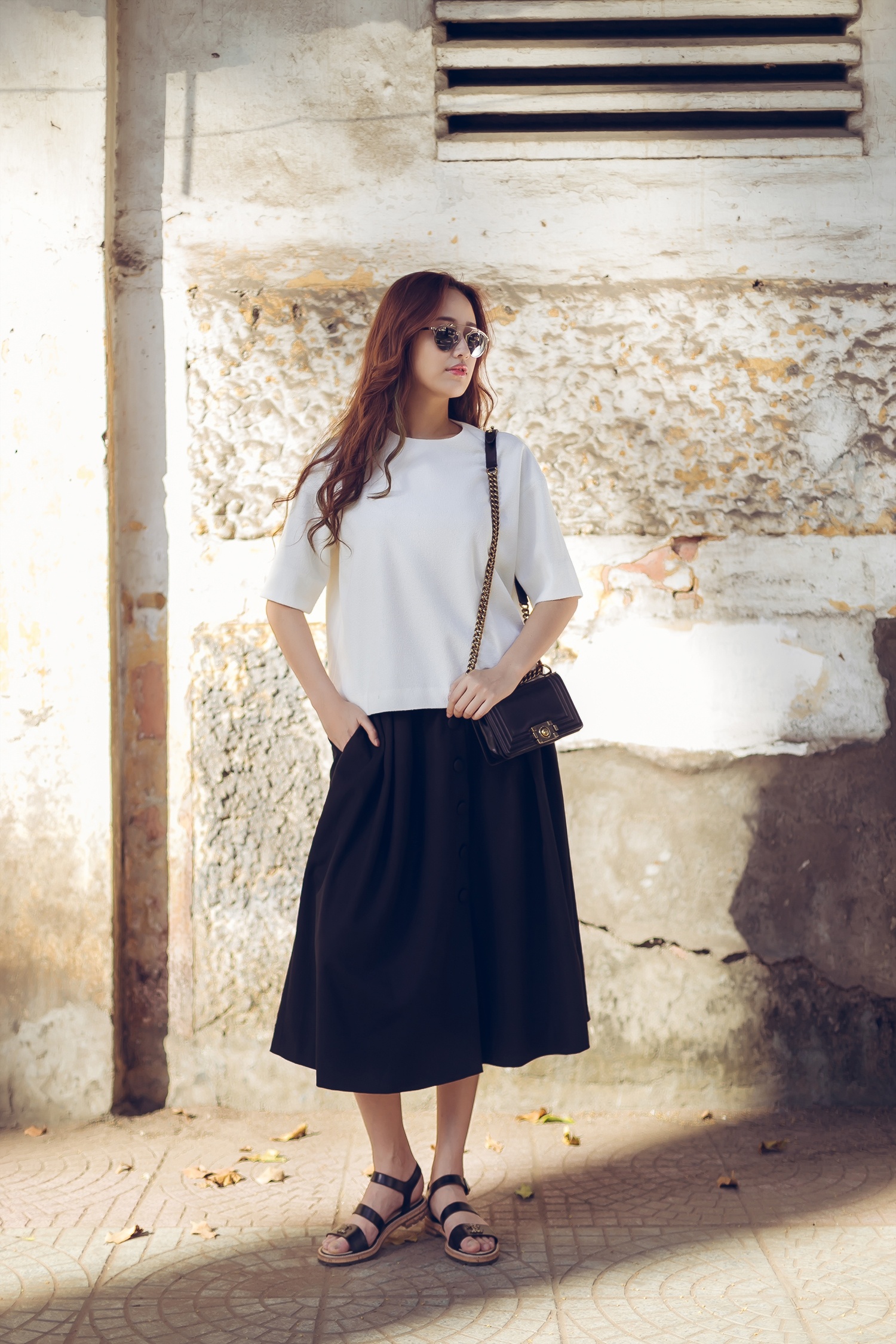 | Ở bộ cánh khác, người đẹp Hà thành tiếp tục lăng xê tông màu trắng đen. Cô diện bộ váy nữ tính gam màu trong trẻo, túi xách tối màu hài hòa. |