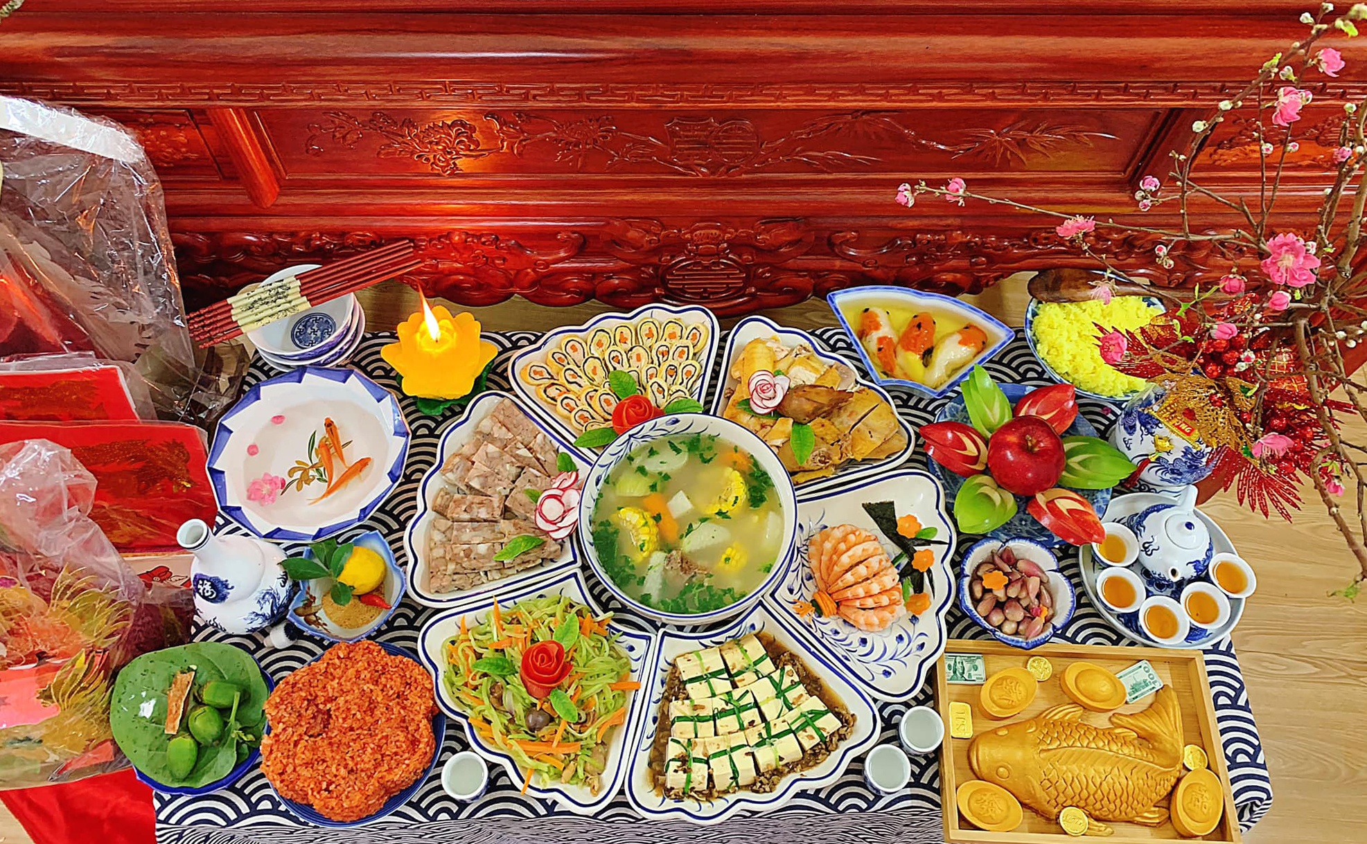 | Tài khoản Vũ Thanh Hoan đăng tải mâm cúng tự tay làm trong hơn 1 giờ đồng hồ với nét truyền thống kết hợp hiện đại. Canh bóng, tôm chiên tempura, chim cút nướng, nem rán, xôi gấc, gà xào hạt điều, rau củ luộc, bánh trôi được trình bày khá hấp dẫn. Theo chị, cúng rằm tháng Giêng là nét đẹp văn hóa lâu đời, dù bận đến mấy, người Việt cũng luôn dành một ngày để làm mâm cơm tươm tất. Ảnh: Vũ Thanh Hoan. |