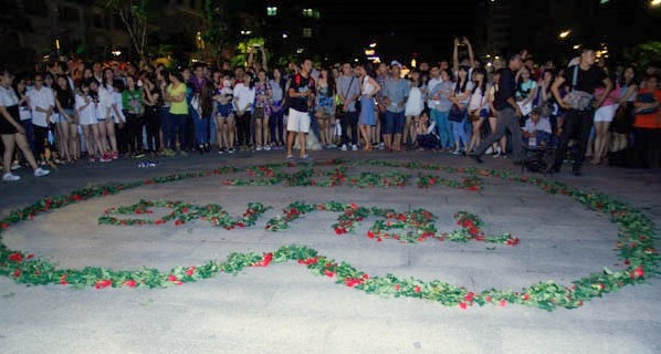 Lúc 23h30, ngày 28/8, tại phố đi bộ Nguyễn Huệ (TP HCM) hàng trăm bạn trẻ có dịp chứng kiến màn cầu hôn của một cặp đôi kéo dài 10 phút, với 50 người nhảy flashmob, 999 hoa hồng và 10 chiếc xe môtô.