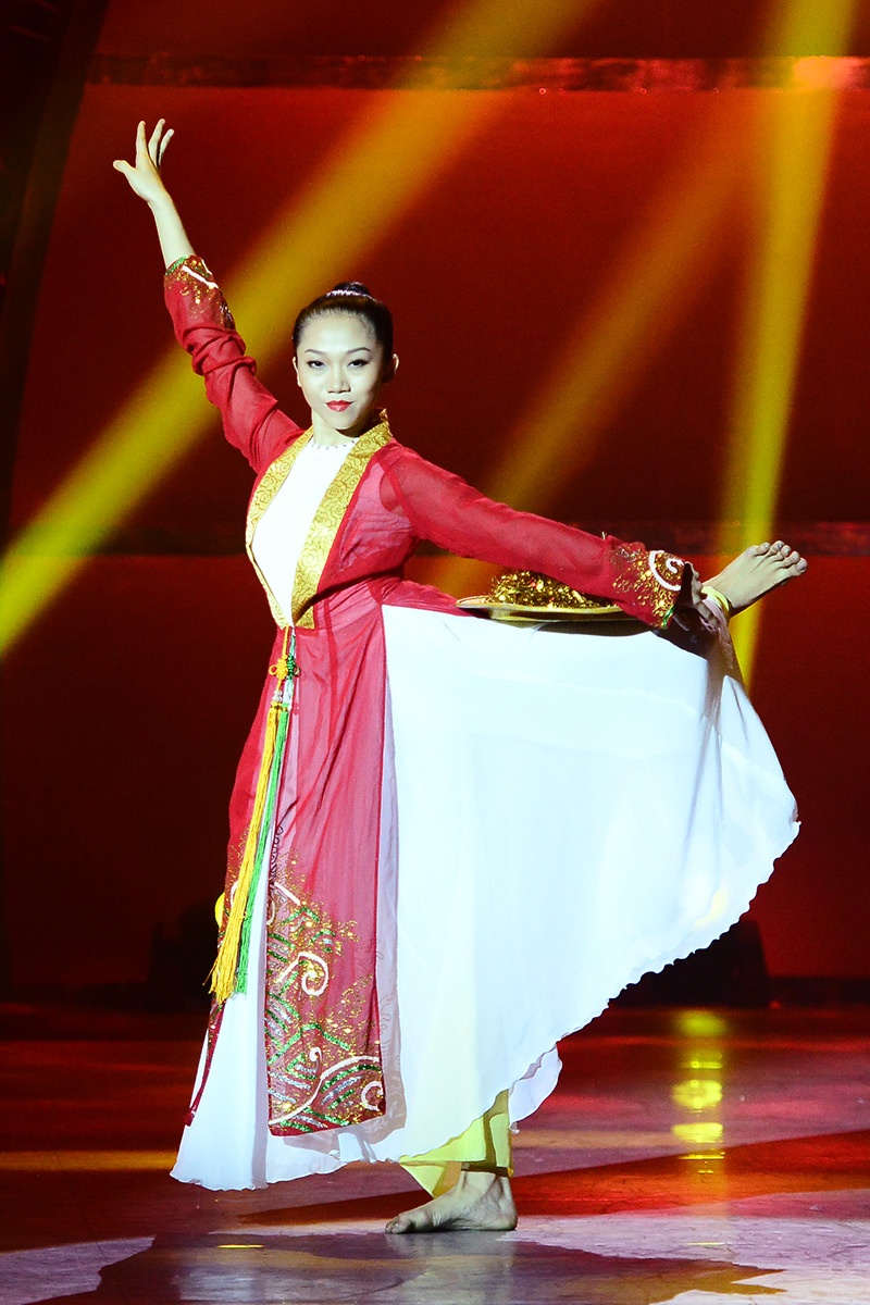 Minh Tú nhẹ nhàng trong áo tứ thân truyền thống với tiết mục Múa mâm. |