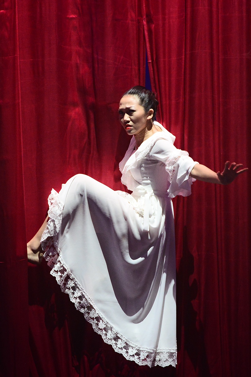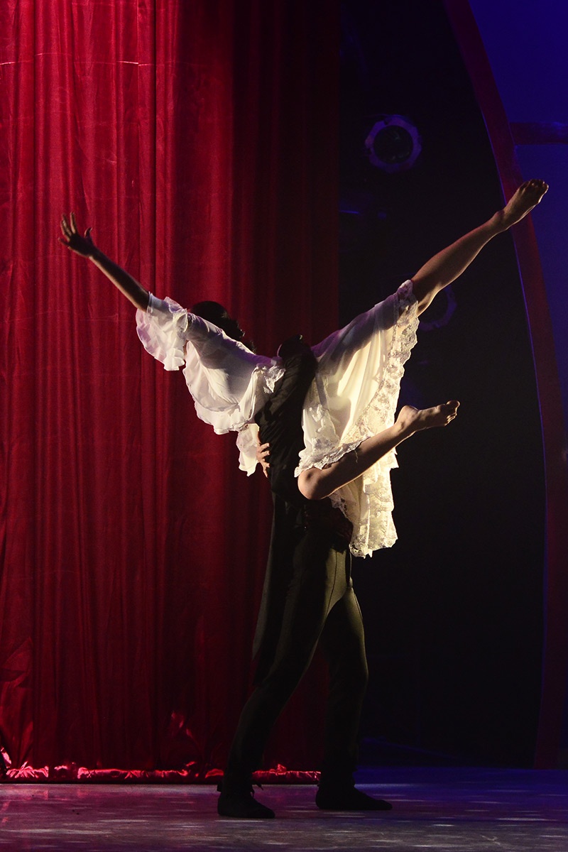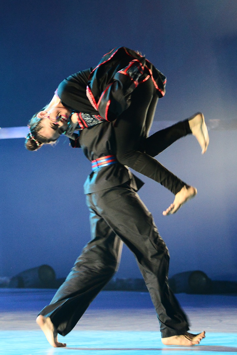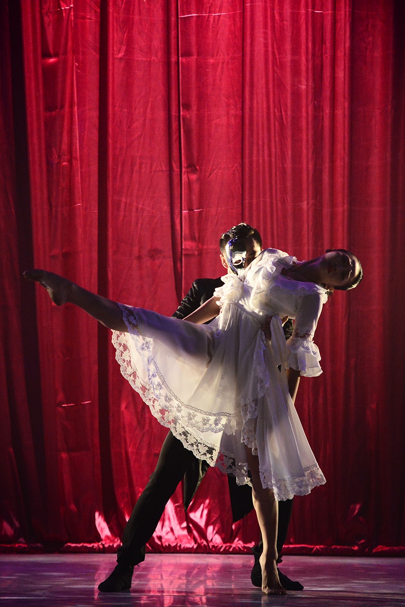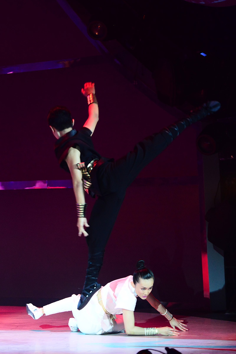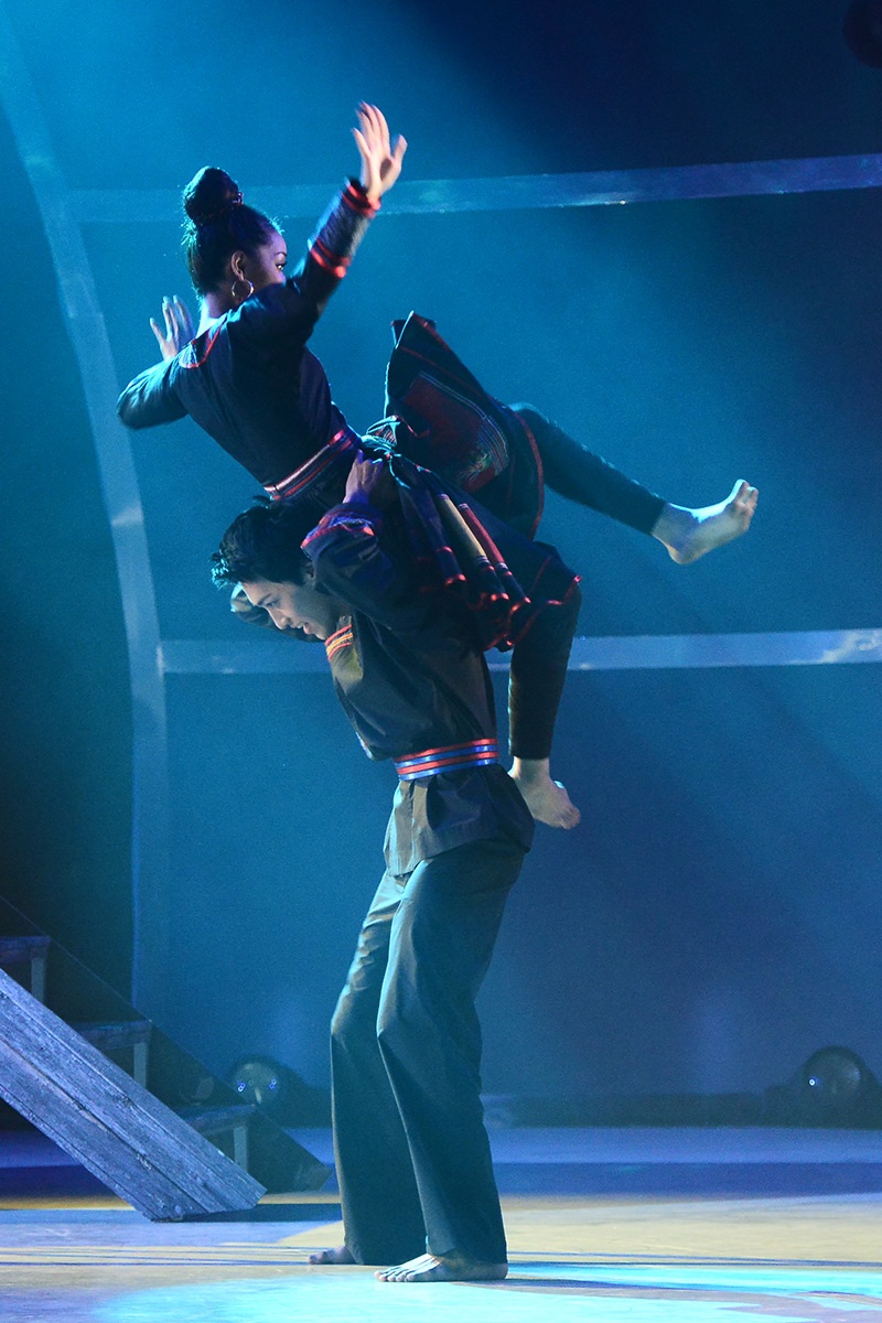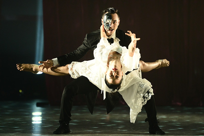 Chàng trai mang mặt nạ và cô nàng tiểu thư cùng múa đương đại. Họ từ cánh gà bước ra với những động tác bê đỡ “thót tim” đầy nguy hiểm. |