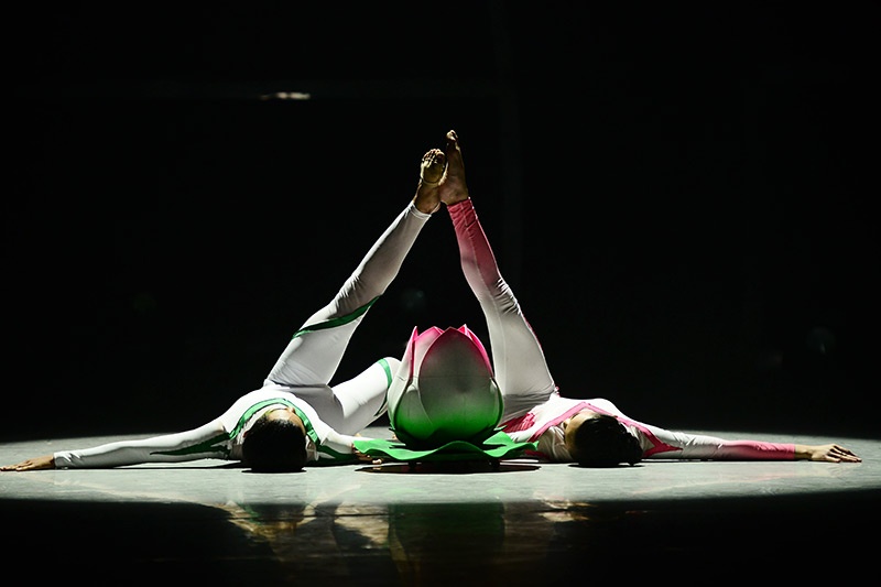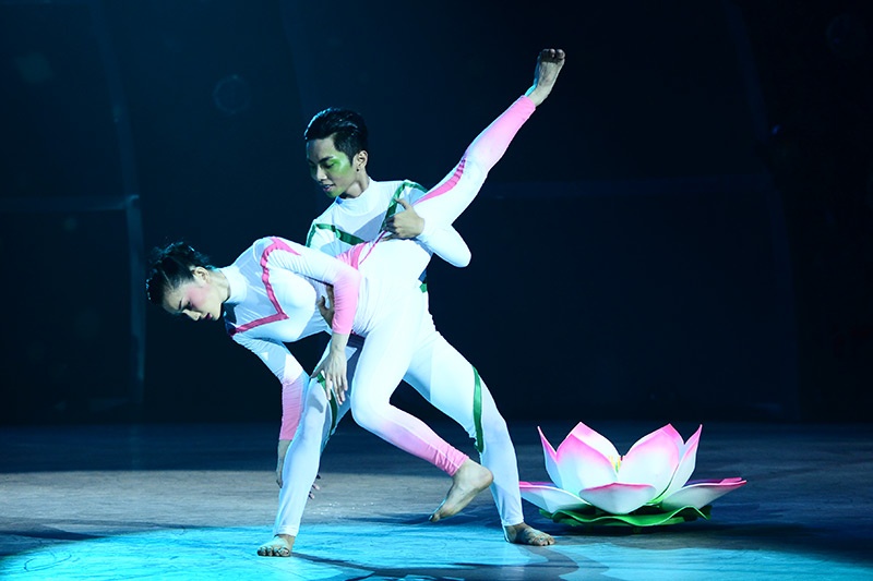 Ở bài múa đương đại, họ trở thành hiện thân của trời đất khi từ một thế giới huyền ảo tới để làm cho hoa sen, đại diện của cái đẹp nở rộ. Cả hai như thở cùng nhau, hòa quyện vào nhau trong một không gian thật nên thơ. |