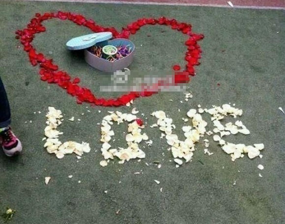 | Điểm nhấn của màn tỏ tình là trái tim và chữ LOVE được xếp một cách kỳ công bằng hoa hồng, ở giữa có đặt một hộp quà hình trái tim với những chiếc kẹo mút đủ màu. |