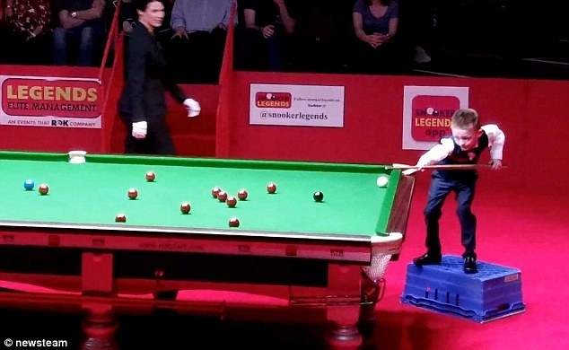 | Westley Cooper phải đứng lên một chiếc thùng nhựa khi chơi Snooker. |