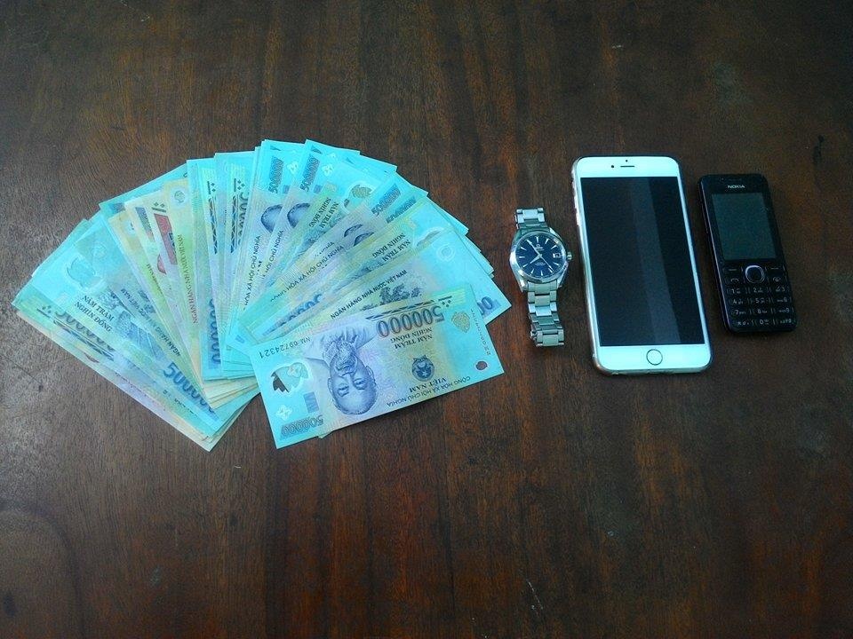 | Số tiền và tài sản mà Sơn và Quân đã lấy cắp. Ảnh: Công an cung cấp. |