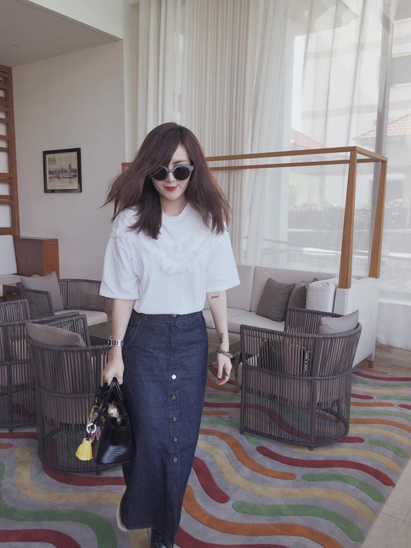 | Áo thun trắng mix kèm váy denim cài cúc cá tính của Yến Nhi rất hợp tiết trời thu. |