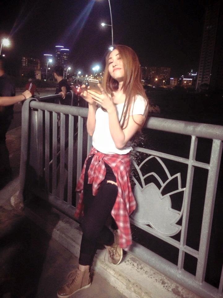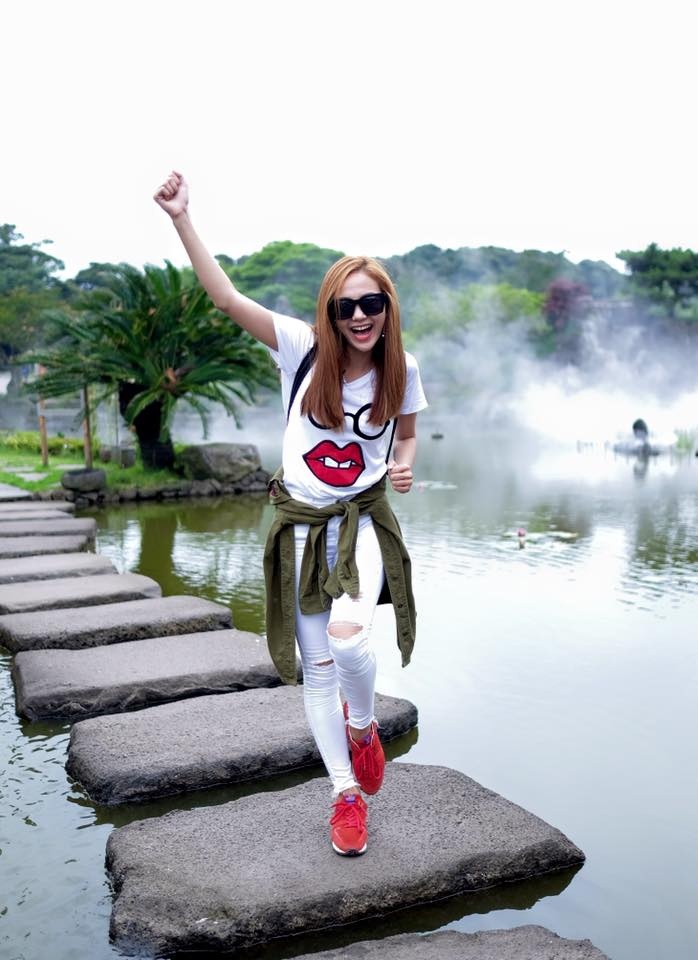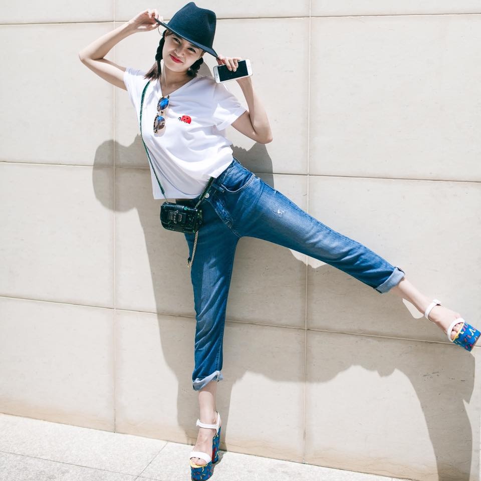 | Lan Ngọc tinh nghịch với lựa chọn quần jeans xắn gấu và áo thun. |