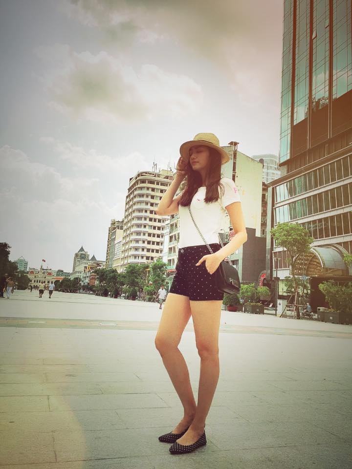 | Thời trang giản dị xuống phố của Bảo Thy với áo thun trắng, quần shorts. |