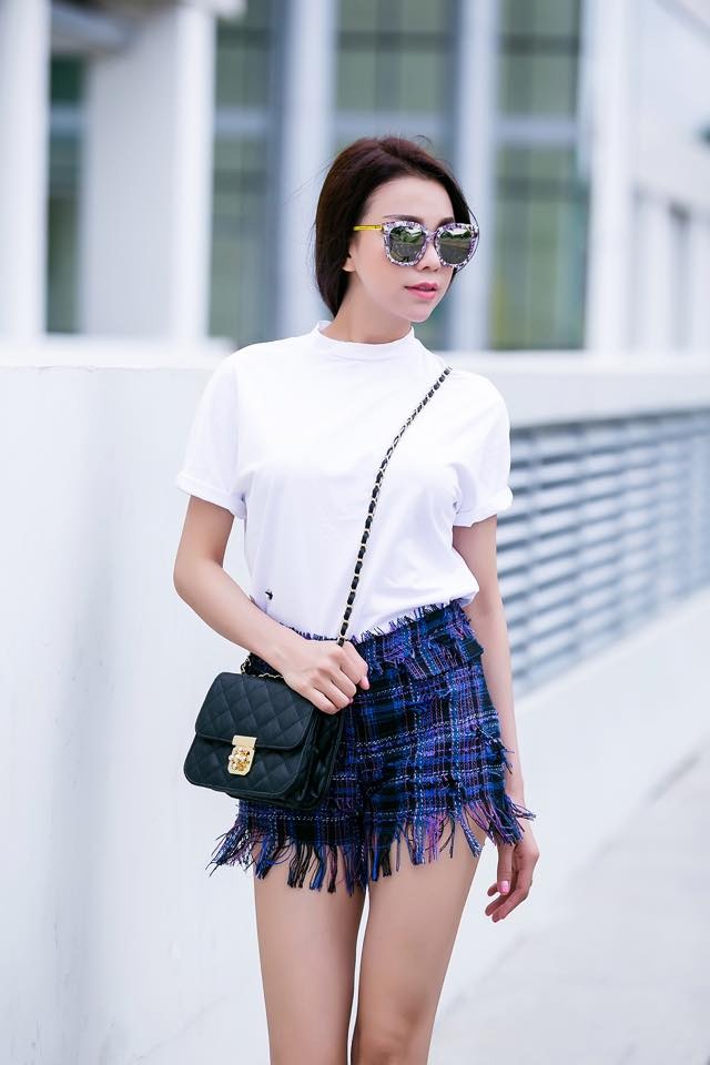 | Áo thun trắng mix kèm chân váy tua rua của Trà Ngọc Hằng giúp trang phục trở nên bớt rối mắt. |