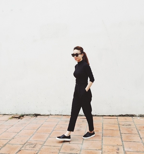 | Thanh Hằng mang tới gợi ý trẻ trung với giày slip-on và quần skinny. |