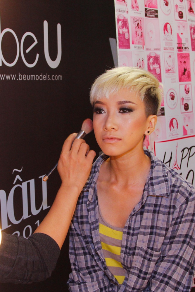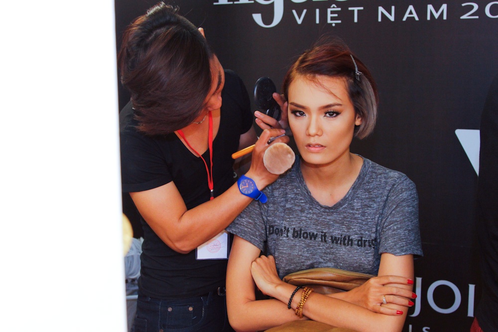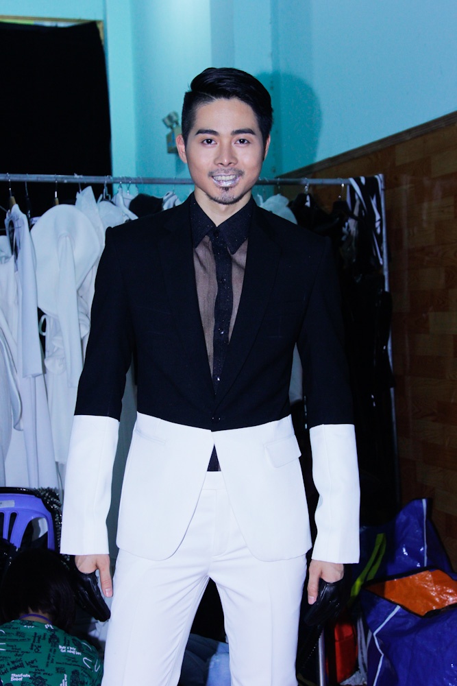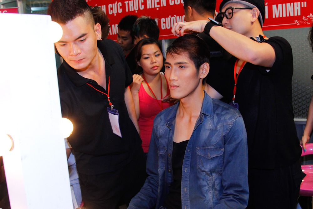 Sau khi thay đổi trang phục, Tuấn Việt được chuyên viên trang điểm lo phần dậm phấn nền và chỉnh lại mái tóc.