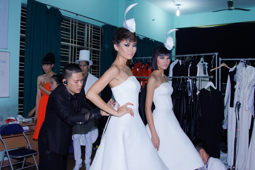 Chà Mi được NTK chỉnh lại trang phục trước khi bước lên sân khấu.