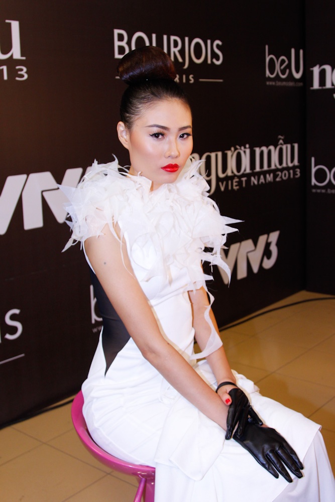 Mai Giang đã hoàn tất công tác chuẩn bị, cô ngồi chờ đợi lượt diễn của mình.