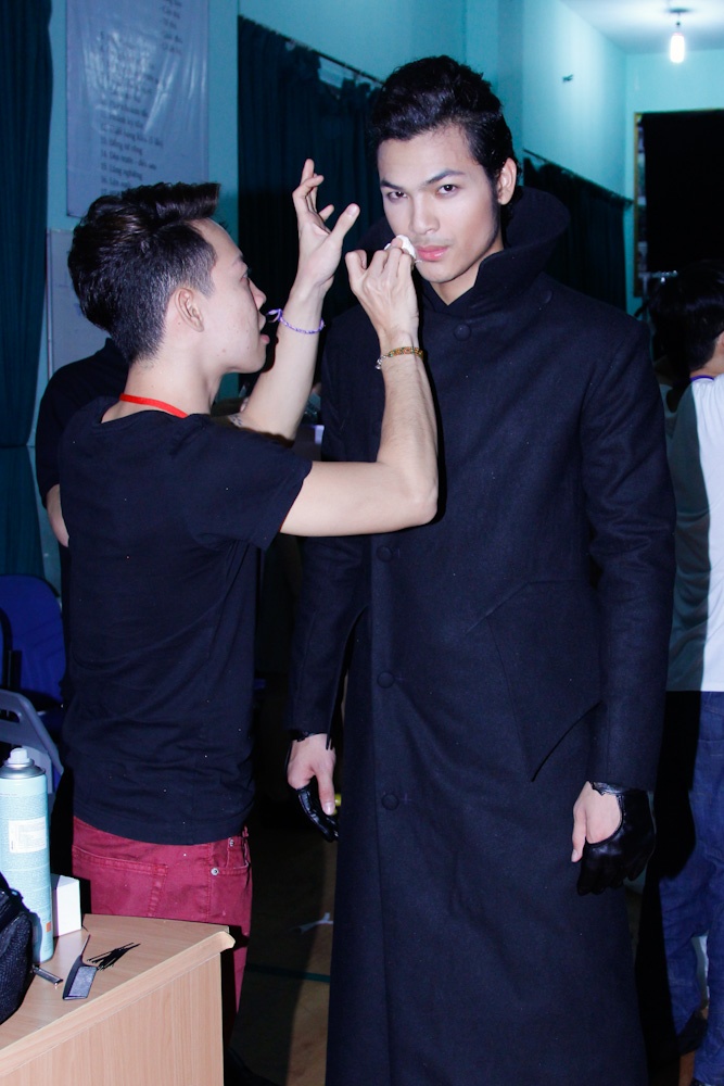 Quang Đại được trợ lý lo phần trang điểm cho khuôn mặt ấn tượng, anh đảm nhận trình diễn BST của NTK Hoàng Minh Hà.