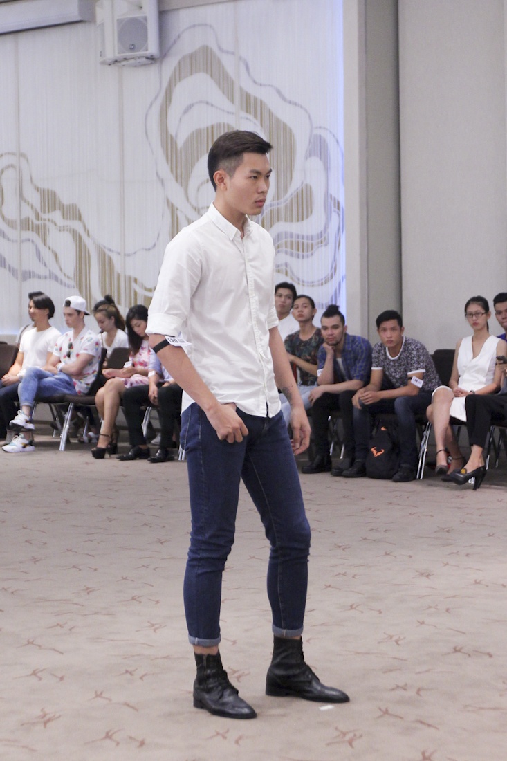 | Thí sinh nam diện trang phục đơn giản áo sơ-mi quần jeans tham gia buổi tuyển chọn. |