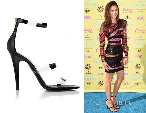 | Nina Dobrev chọn sandals quai ngang với phần phối màu đen phù hợp trang phục. |