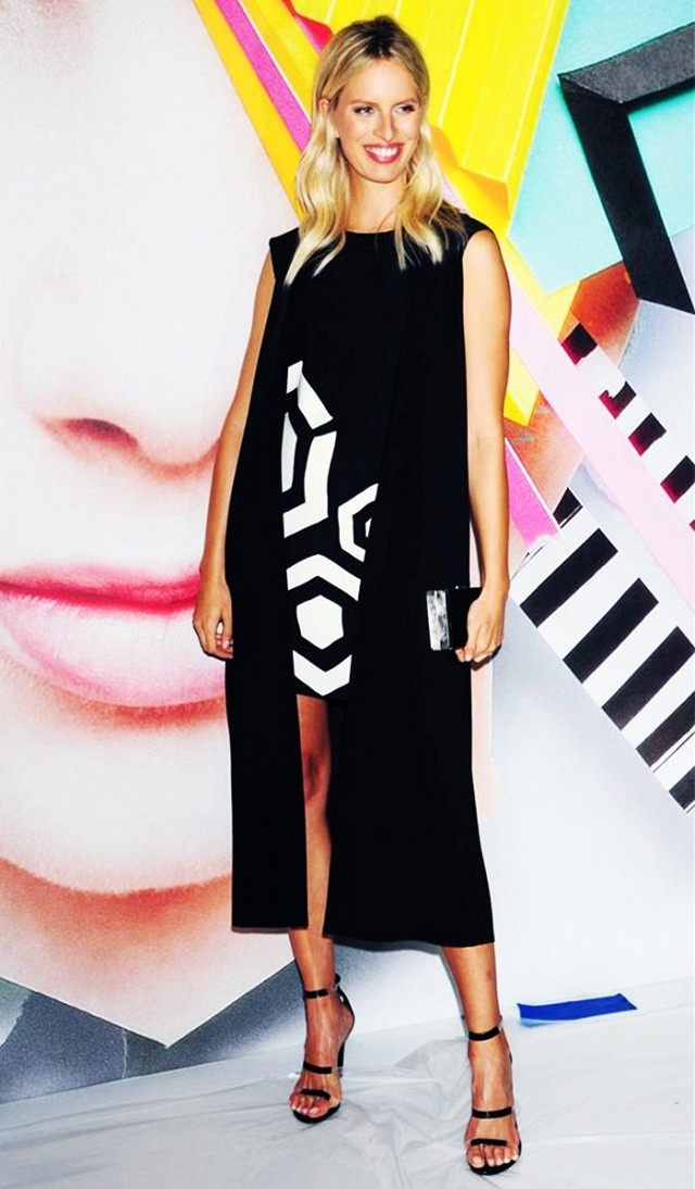 | Karolina Kurkova phối sandals đen và mốt váy đen trắng sành điệu. |