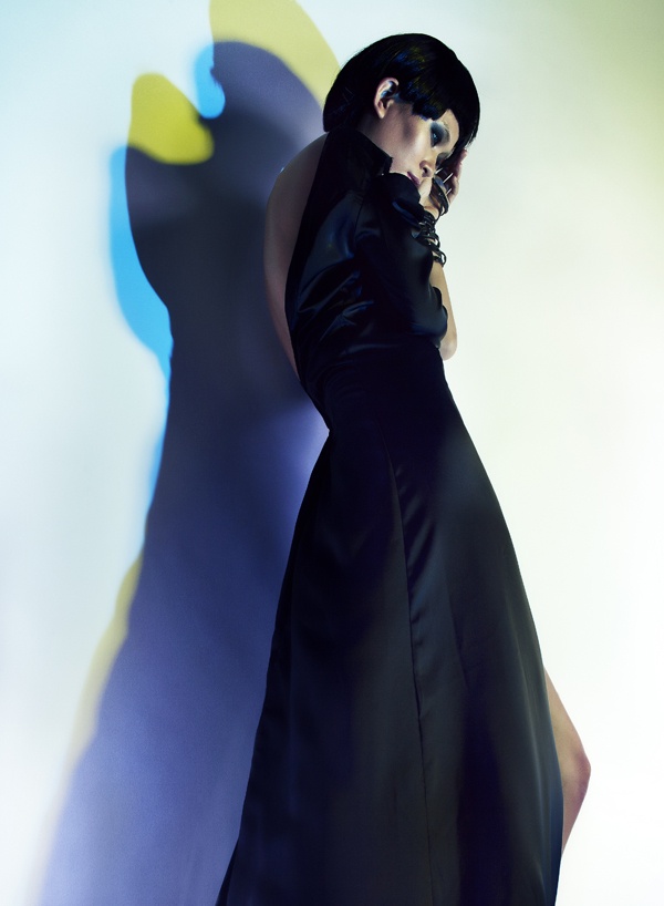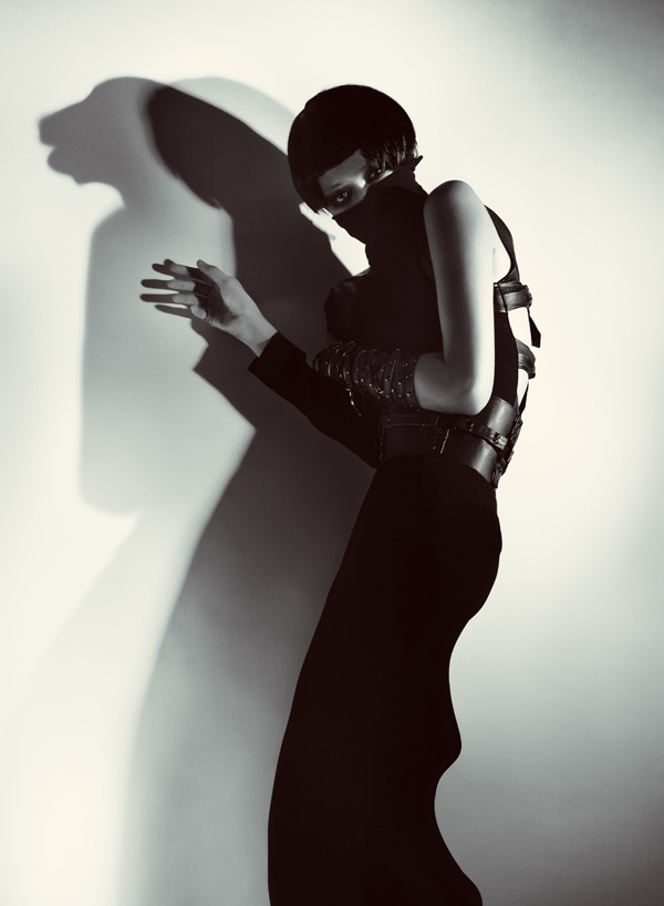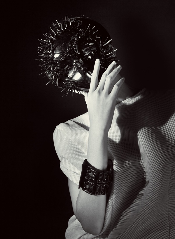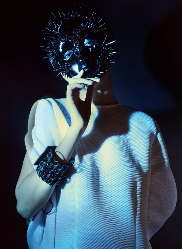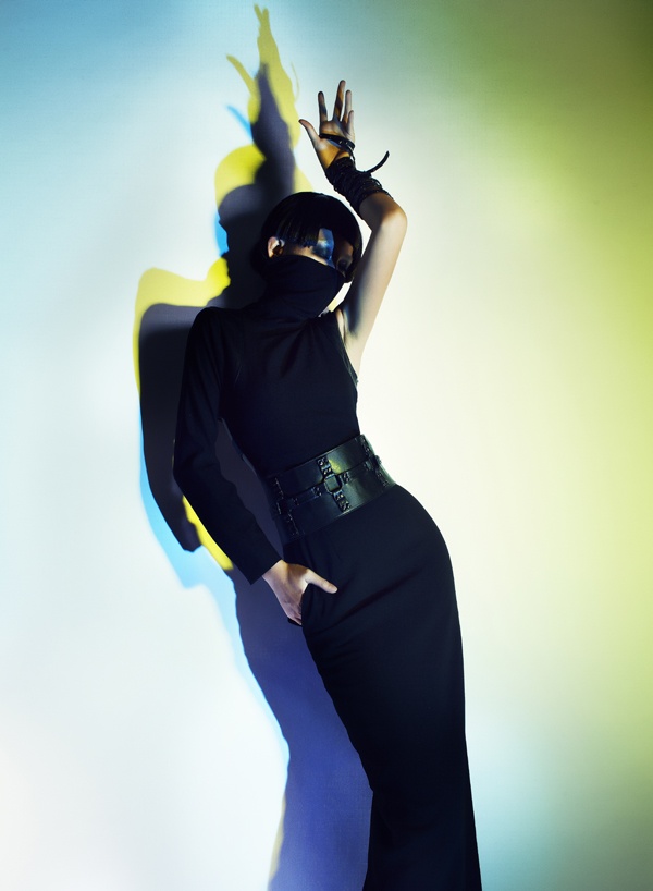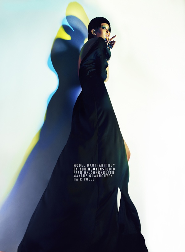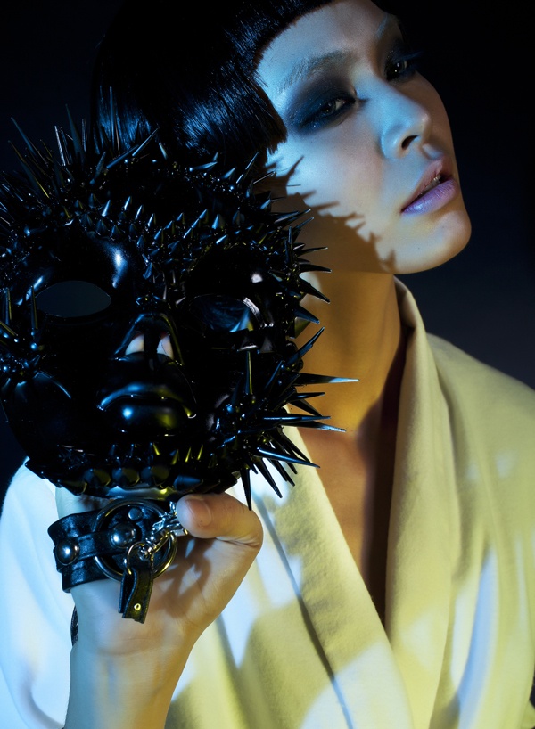 | Trong loạt hình thời trang mới của nhà thiết kế trẻ Đông Nguyên, Mâu Thanh Thủy che kín mặt, chỉ để hở đôi mắt sắc lạnh. |