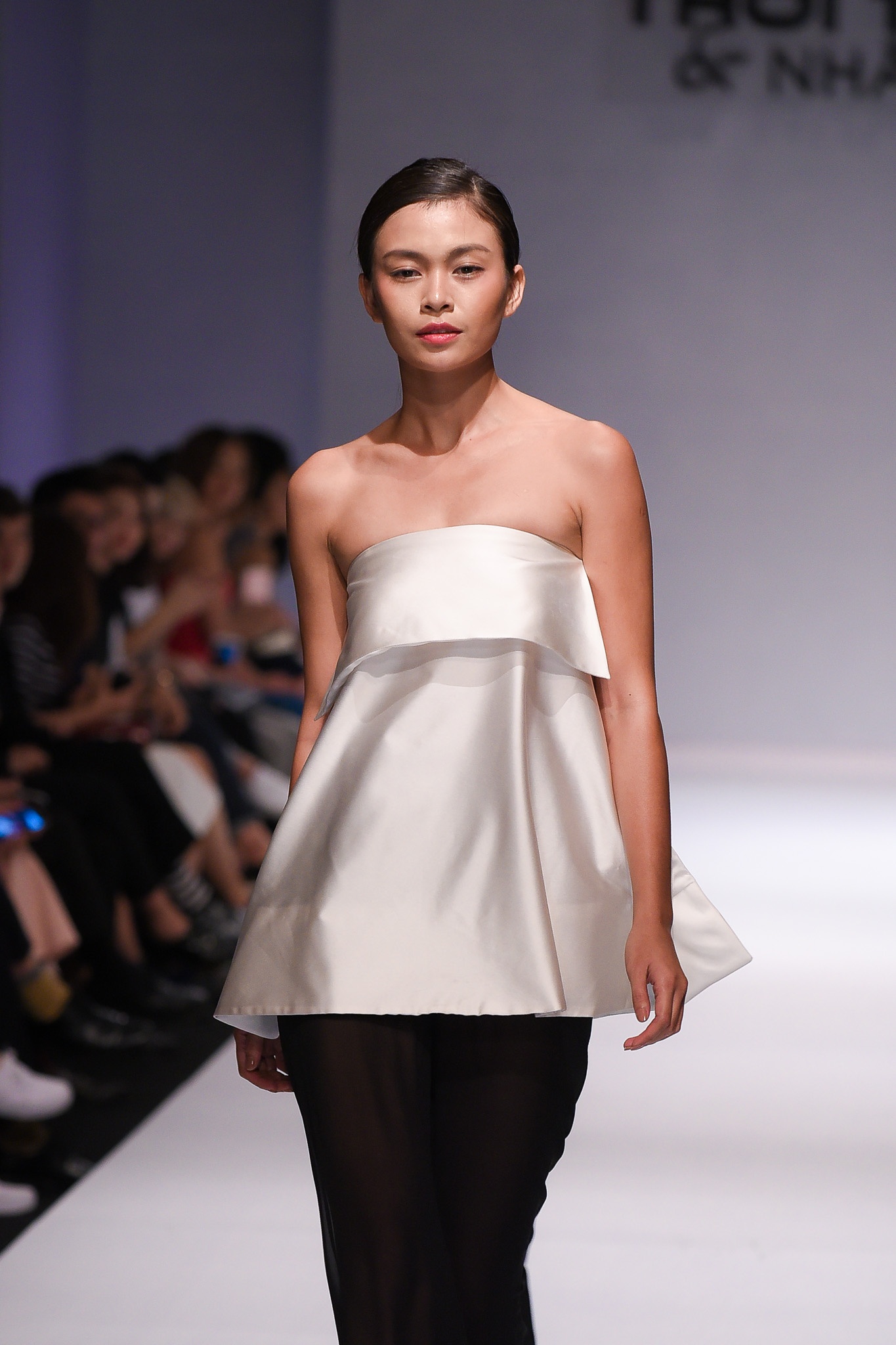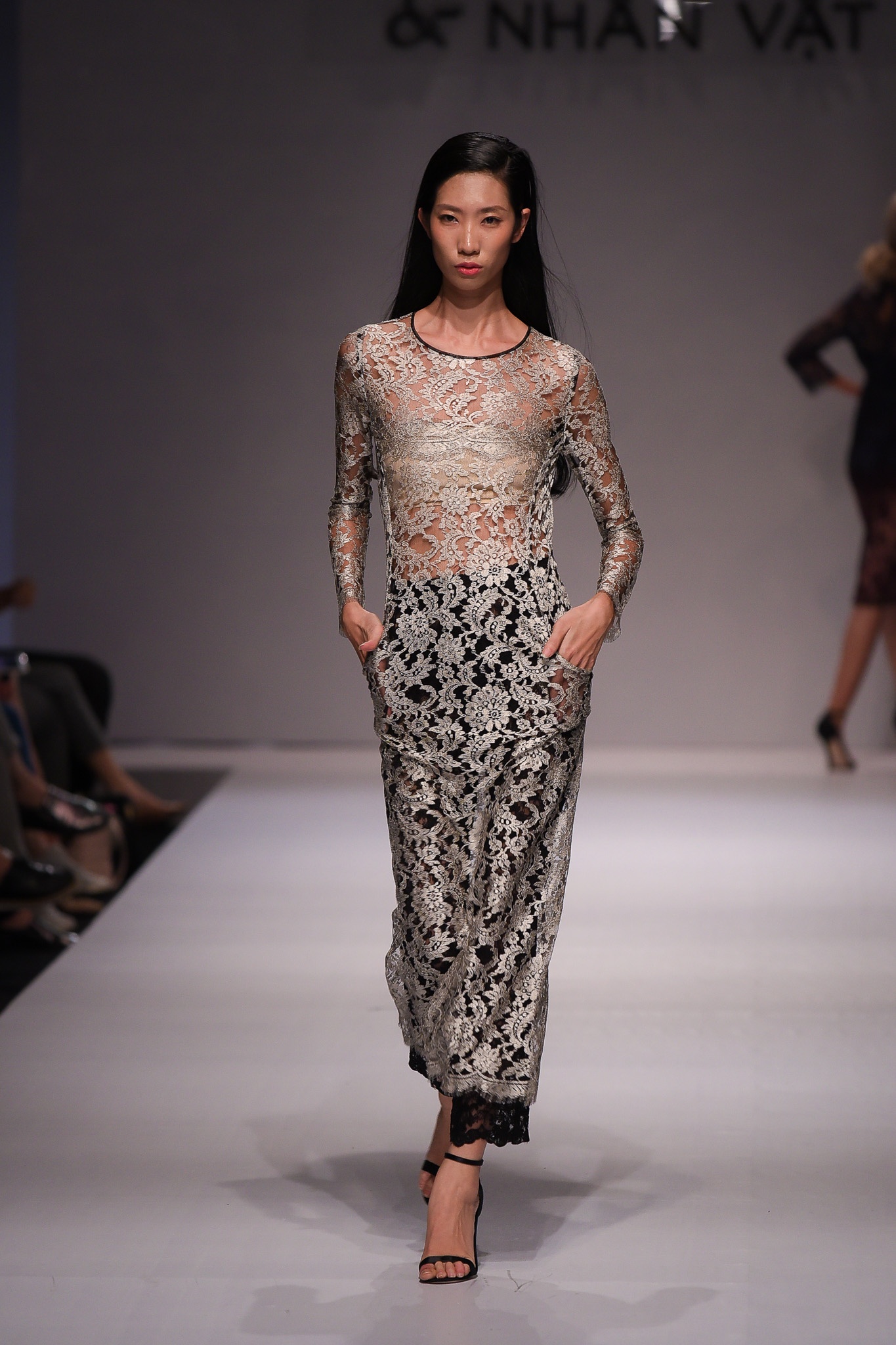 | Trang Phạm trình diễn mẫu đầm ren trắng đen. Bộ sưu tập để lại ấn tượng với người xem bởi tông màu, chất liệu, đường cắt tối giản, hợp xu hướng. |