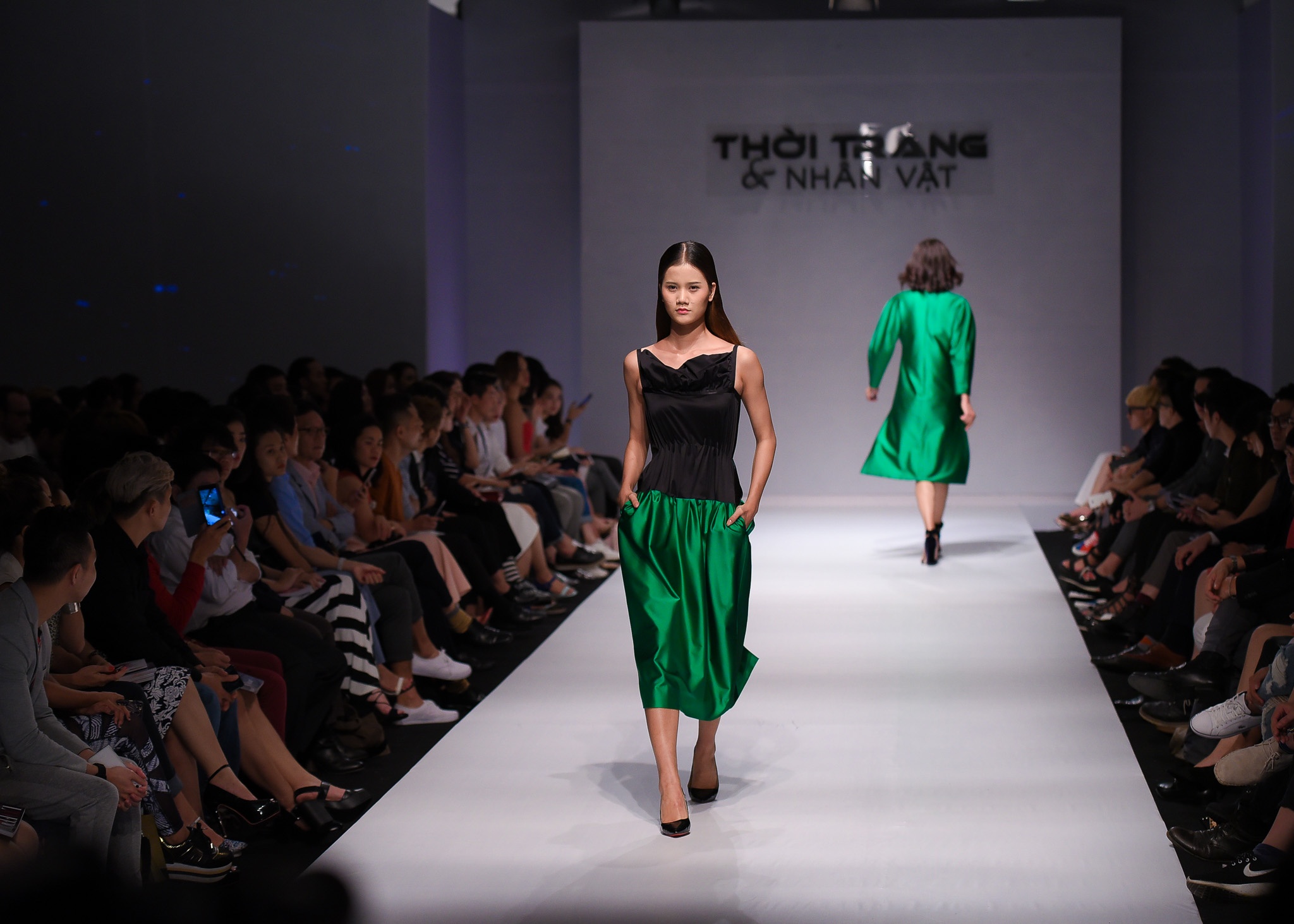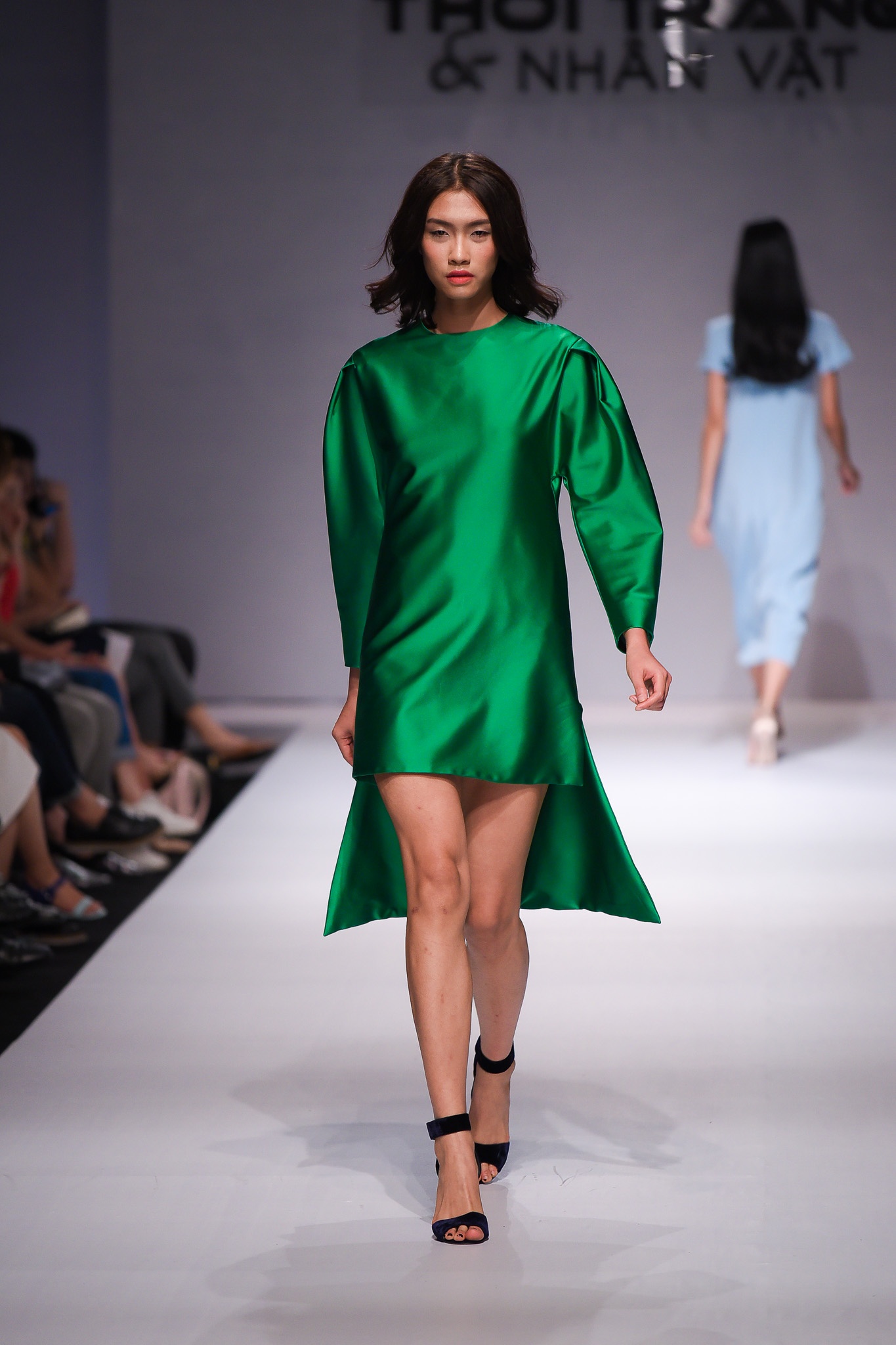 | Quán quân Vietnam's Next Top Model 2014 - Nguyễn Oanh - diện bộ cánh xanh lá cây tươi tắn trình diễn tự nhiên. |