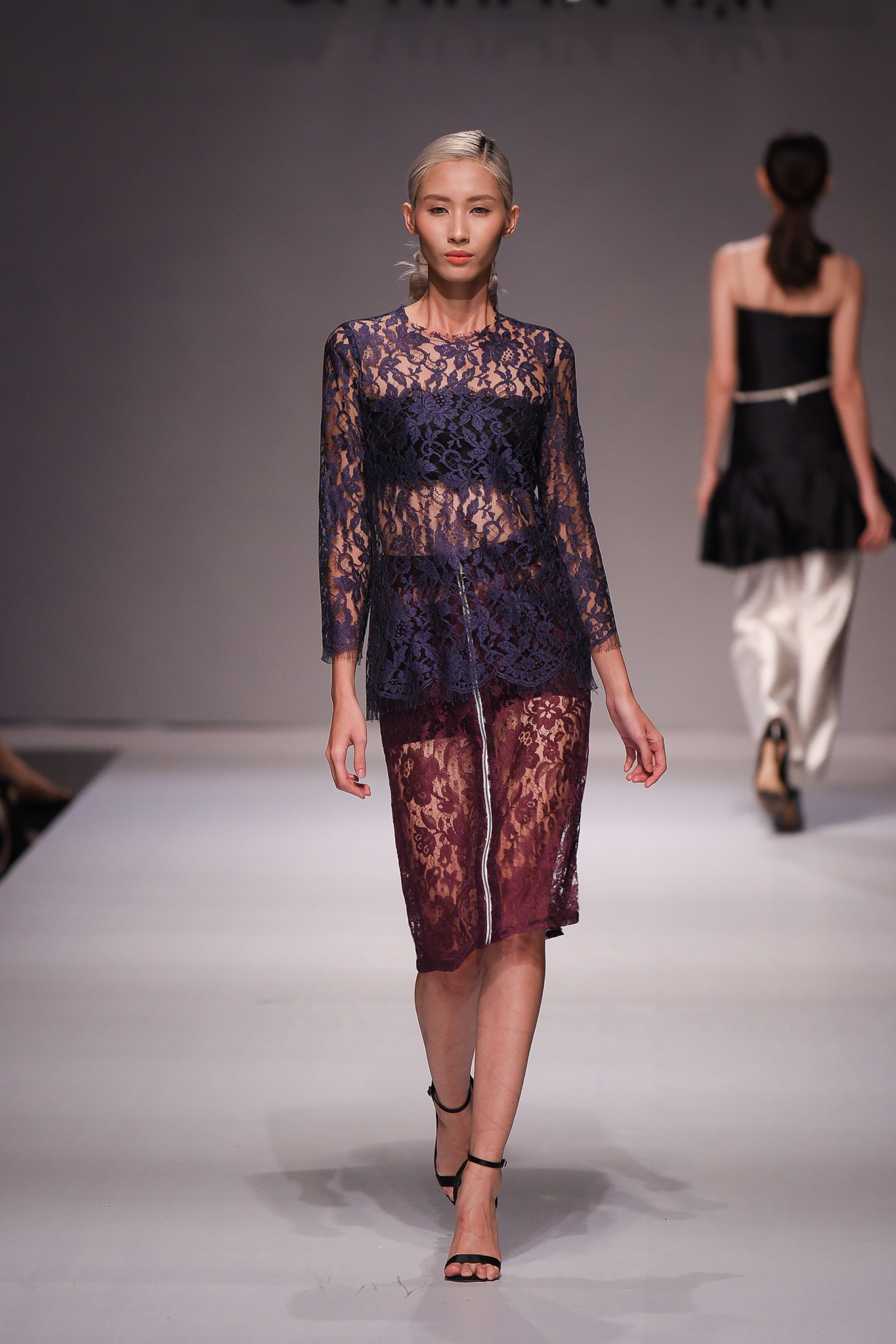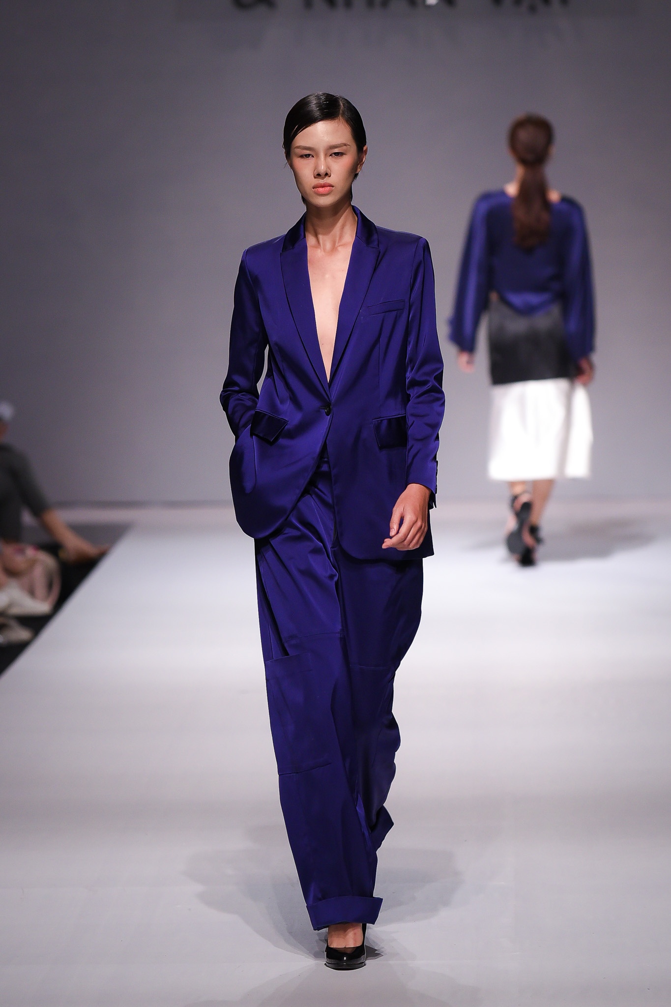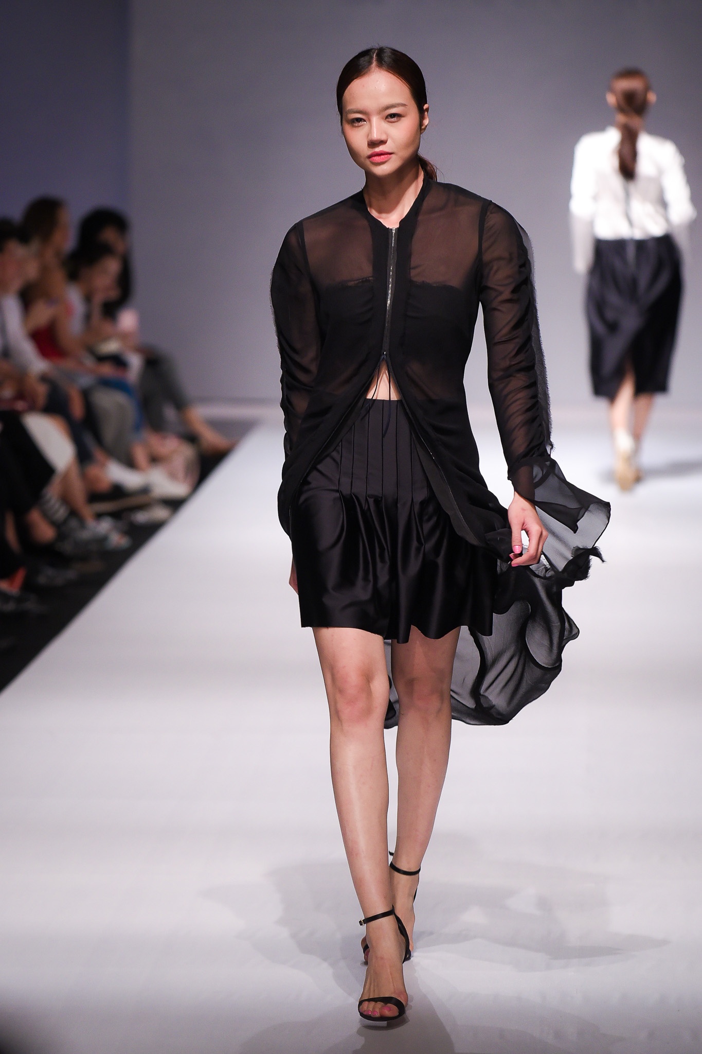 | Quán quân Vietnam's Next Top Model 2015 - Hương Ly - cũng góp mặt trên sân khấu thời trang xuân hè. Cô thể hiện bộ cánh tông đen xanh hiện đại. |