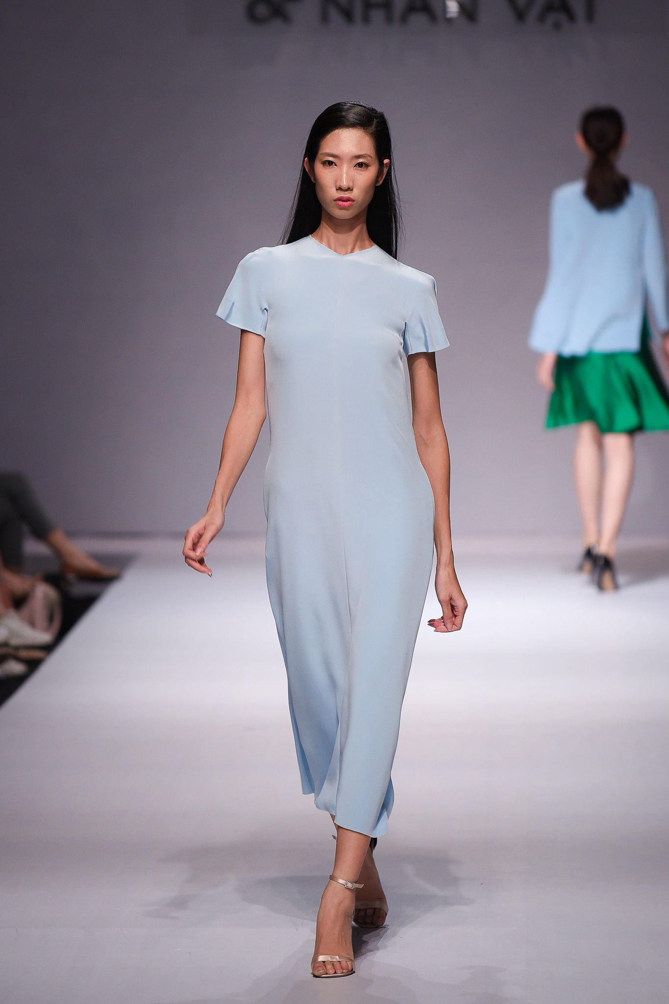 | Dáng đầm suông rộng, tông màu xanh nhẹ rất phù hợp vóc dáng của Trang Phạm. Cô đi giày dây mảnh ăn nhập trang phục. |