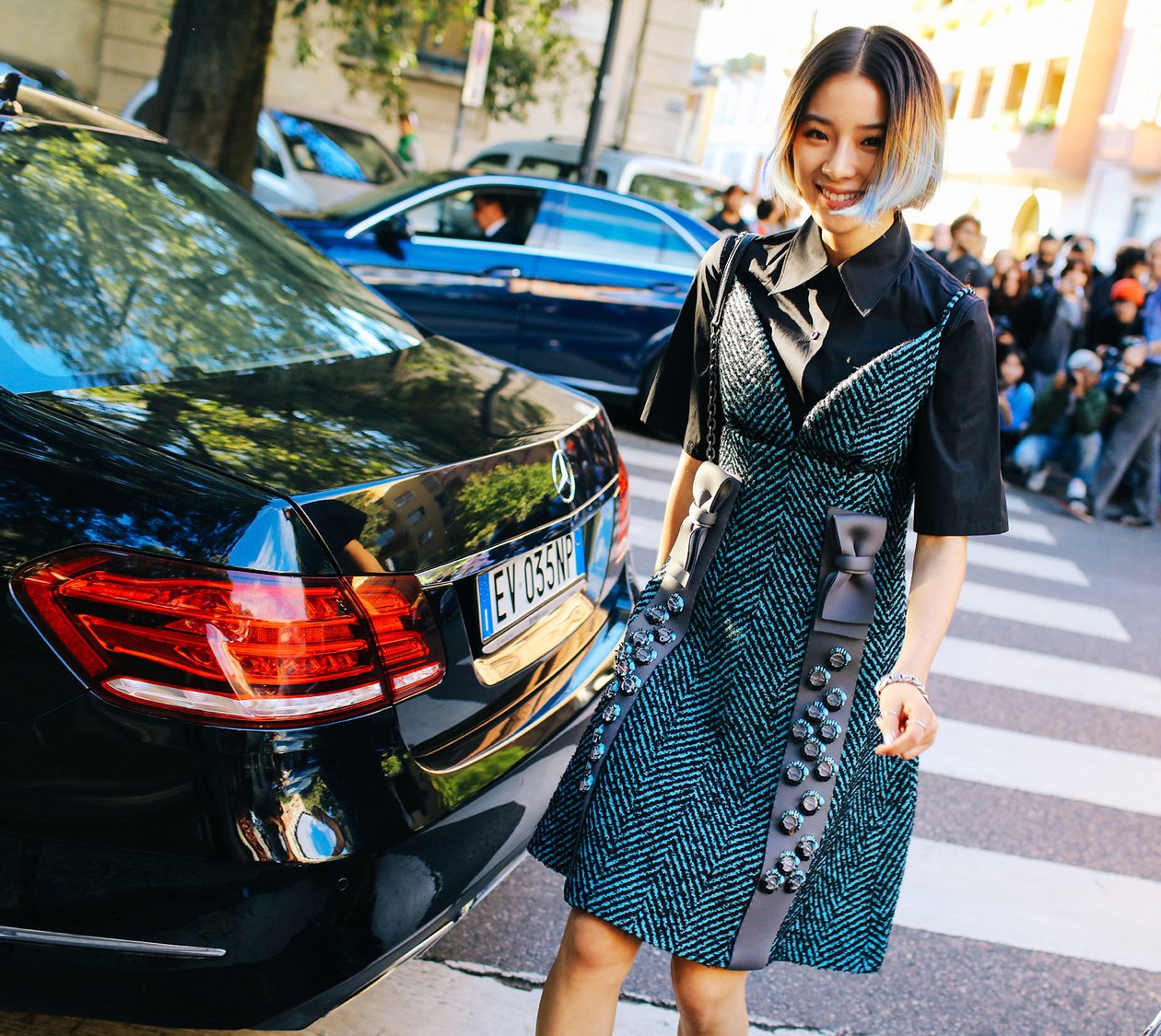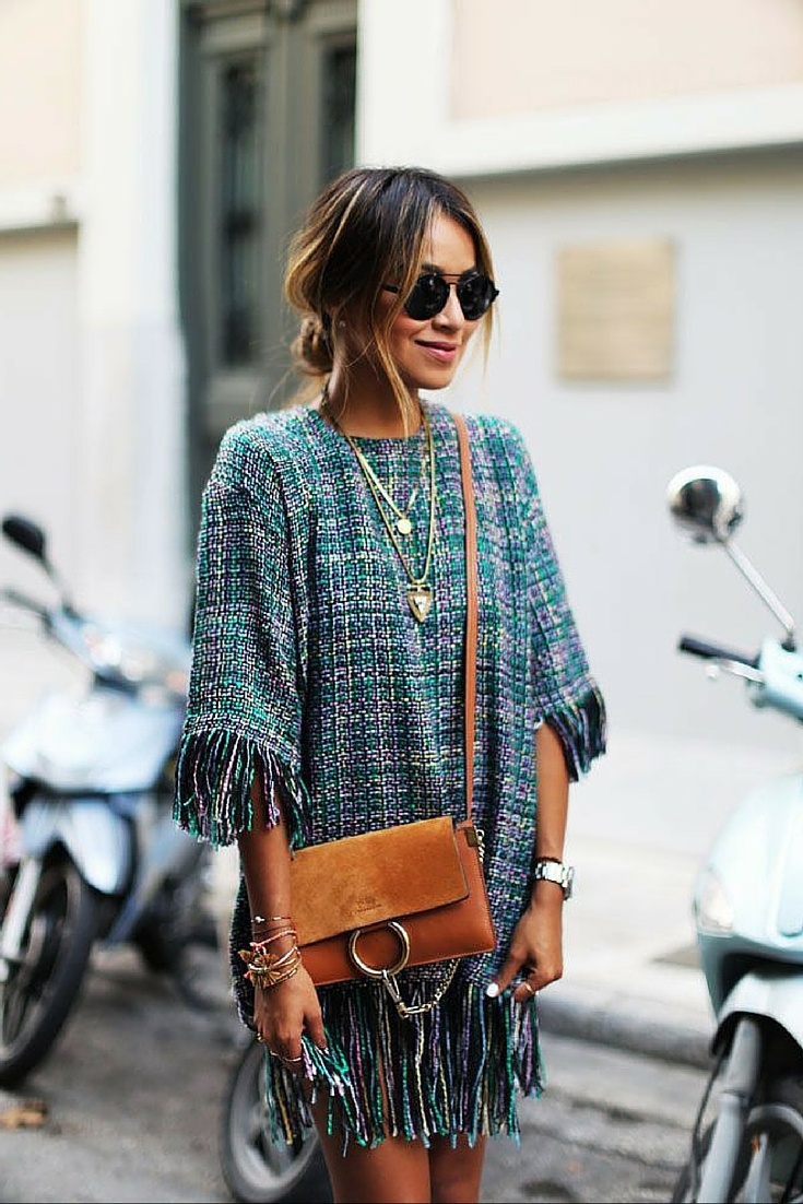 | Nổi bật trên phố với áo choàng dài rực rỡ kết hợp váy tweed trẻ trung. |