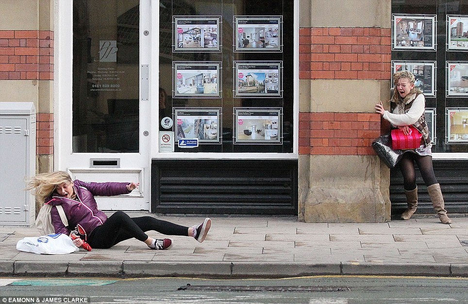 Gió mạnh hất ngã người đi bộ trên vỉa hè các tuyến phố ở trung tâm thành phố Manchester chiều qua theo giờ địa phương. Theo các phương tiện truyền thông, một người đàn ông ngoài 70 tuổi đã chết vì điện giật trong lúc cắt cành cây đổ. Ảnh: Daily Mail. |