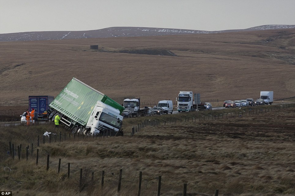Giao thông tắc nghẽn vì một chiếc xe tải bị hất khỏi đường chính. Ảnh: AP. |