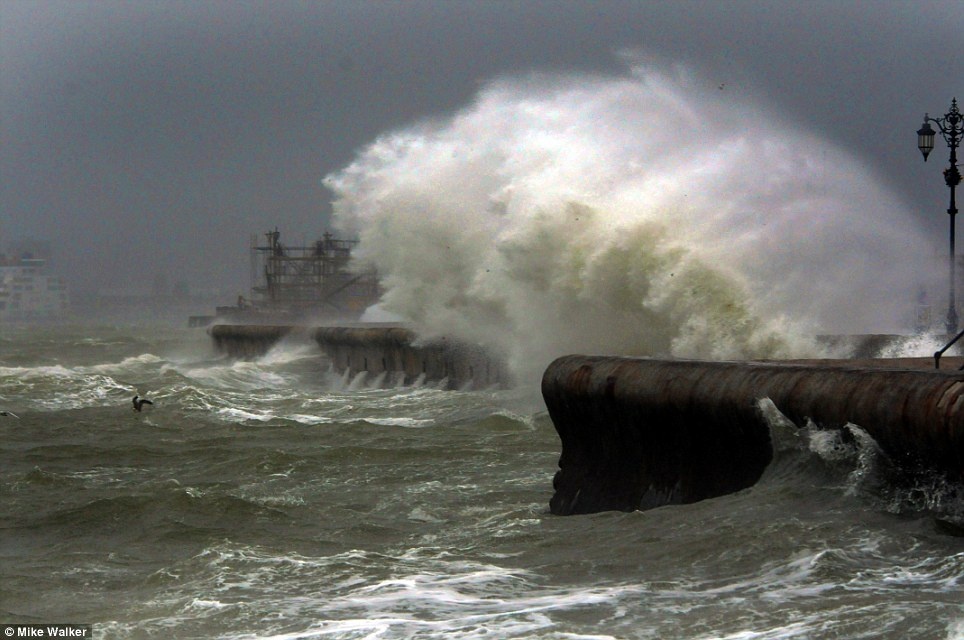 Gió lớn khiến những đợt sóng mạnh liên tiếp ập vào bờ kè ven biển Southsea, Hampshire. Ảnh: Daily Mail. |