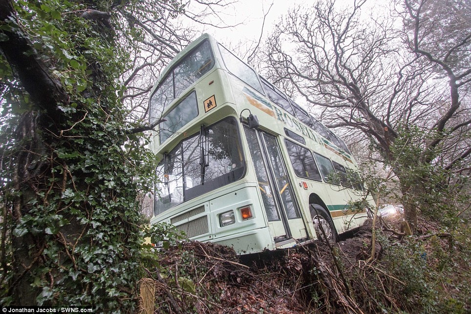 Chiếc xe bus 2 tầng suýt lao xuống vực khi tránh một cành cây gãy trên con đường ở Cornwall. |