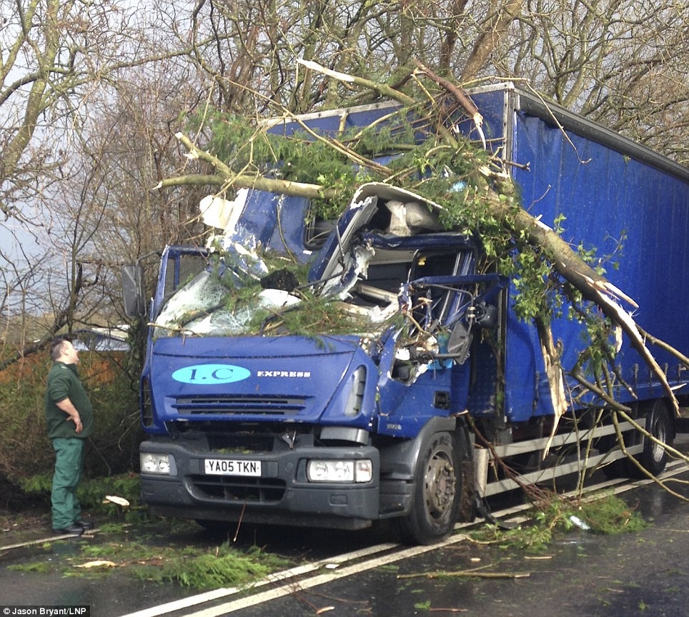 Cành cây đè bẹp phần đầu chiếc xe tải đang lưu thông trên con đường cao tốc A39 gần Bridgwater, Somerset. Ảnh: Daily Mail. |