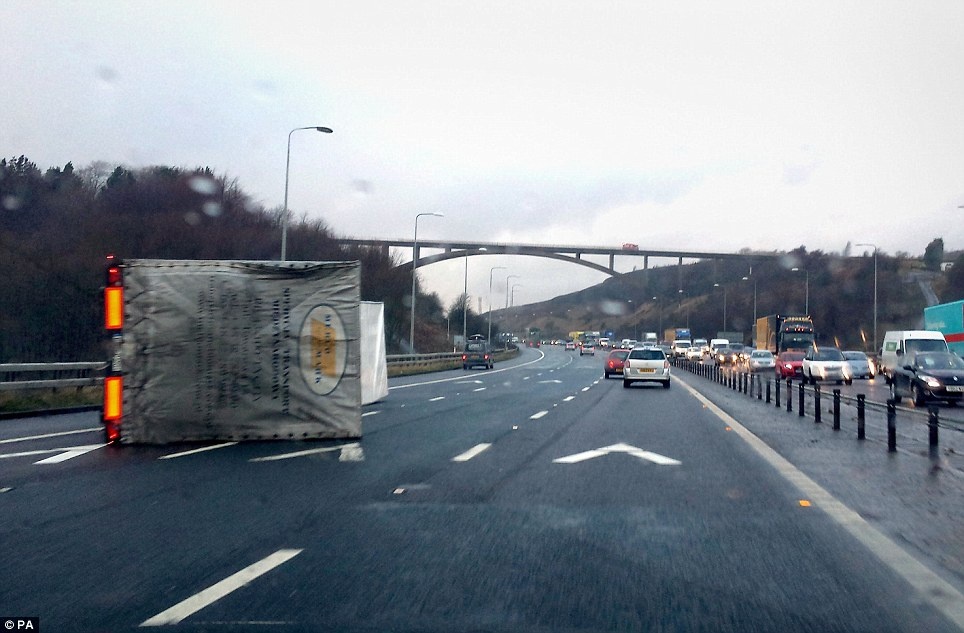 Một chiếc xe tải bị gió mạnh quật ngã khi đang lưu thông trên đường cao tốc M62 đoạn chạy qua West Yorkshire. Ảnh: PA. |