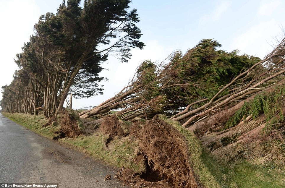 Hàng cây ven đường gần Fishguard, West Wales bật rễ, nghiêng ngả. Ảnh: HEA. |