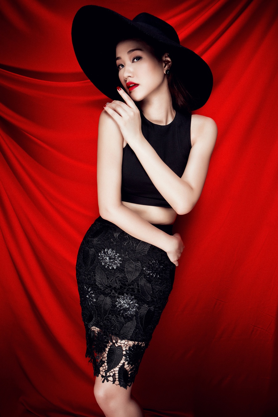 | Trong ảnh, nữ diễn viên - người mẫu diện đầm đan dây, ôm sát khoe đường cong quyến rũ. Thiết kế tối màu đồng thời tôn nước da trắng hồng của ca sĩ Hà thành. |
