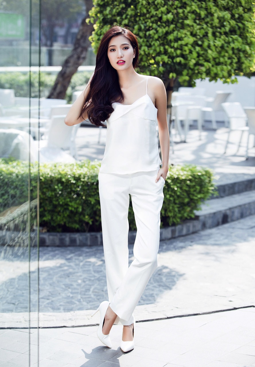 | Trong set trang phục cuối cùng, quán quân Người dẫn chương trình truyền hình khéo léo kết hợp áo hai dây với quần tây, giầy cùng màu tạo điểm nhấn cho trang phục khi xuống phố. Bộ ảnh của Mỹ Linh được thực hiện bởi nhiếp ảnh Lê Thiện Viễn, stylist Mì Gói và trang điểm Phước Lợi. |