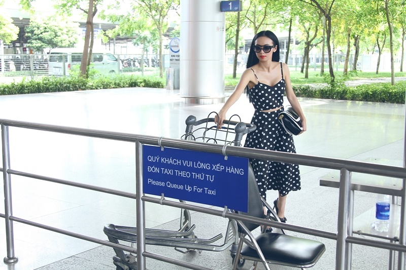 Cô chọn cho mình đầm chấm bi đen trắng, áo cánh màu xanh lá mạ cho trang phục di chuyển máy bay. Dù trải qua chuyến bay dài và mang theo rất nhiều đồ đạc nhưng nữ MC vẫn giữ được phong thái tự tin, rạng ngời với gu trang điểm nhẹ nhàng.