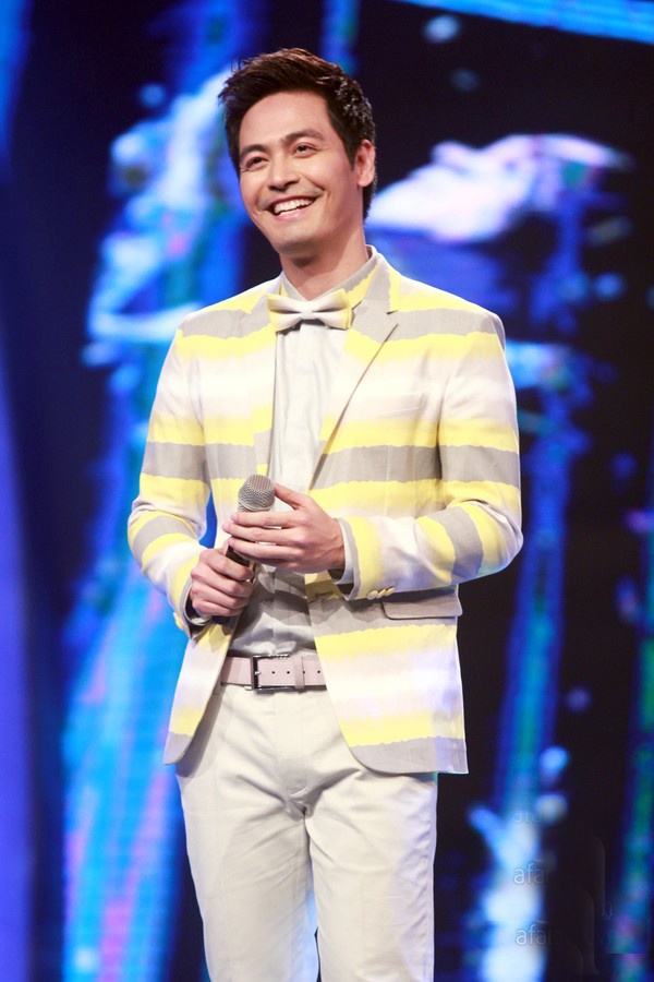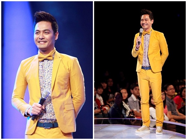 | Một trong những trang phục bắt mắt của Phan Anh trên sân khấu Vietnam Idol. Tông màu vàng rực rỡ được nhấn nhá bởi áo sơ-mi họa tiết hoa nhí và nơ đồng màu. |