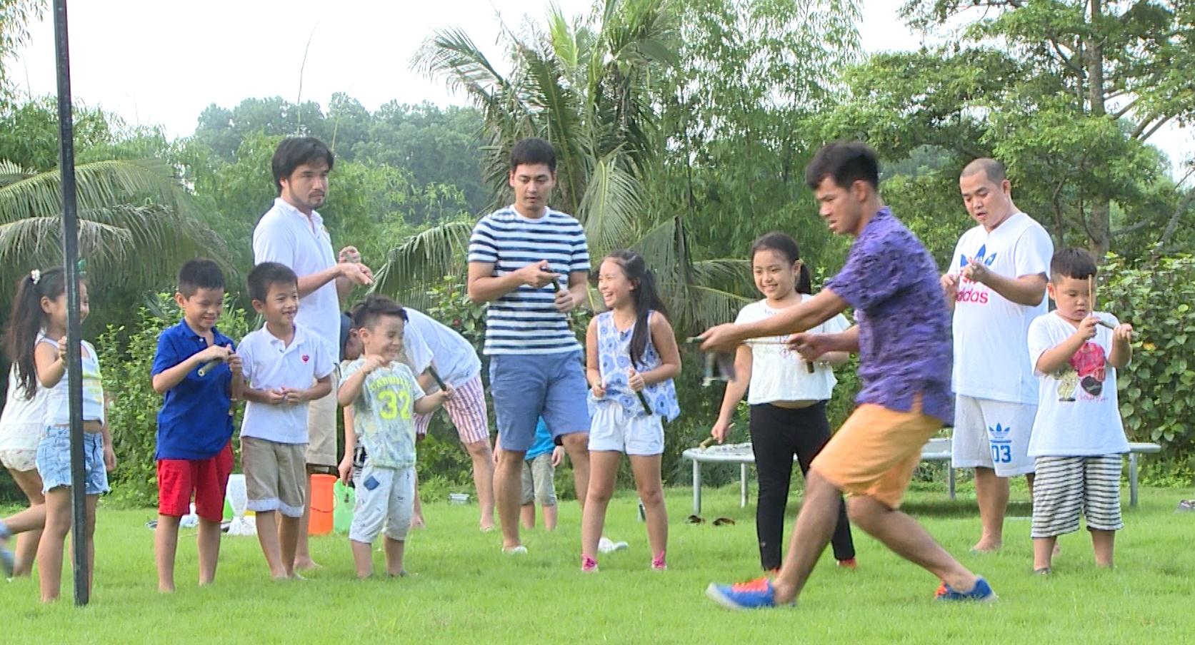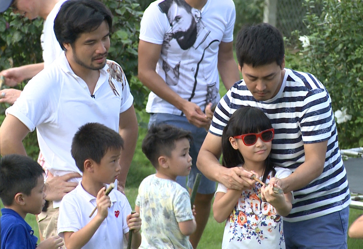 | Trong khung cảnh làng quê yên ả, các bố có cơ hội ôn lại “tuổi thơ dữ dội” bằng việc hướng dẫn các con chơi trò chơi dân gian. Bố Xuân Bắc nhiệt tình "thị phạm" trò chơi bắn “ống phốc”. |