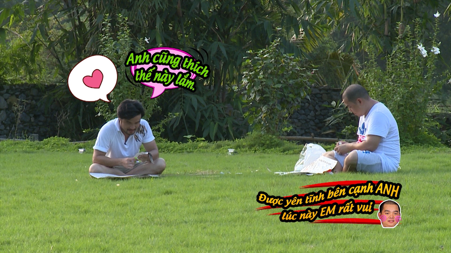 | Trong không khí vui nhộn, hài hước, có một câu chuyện lãng mạn đã âm thầm diễn ra, đó là khoảnh khắc hai bố Minh Đỗ và Minh Khang "tình tứ" dán diều. |