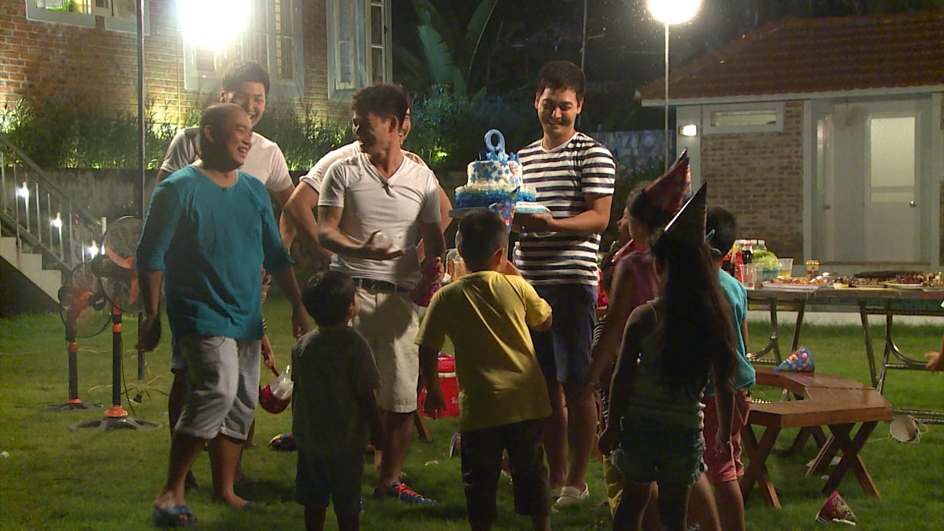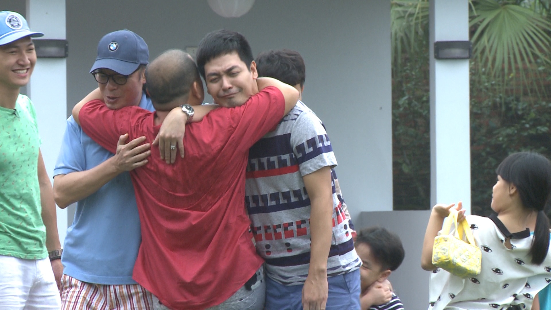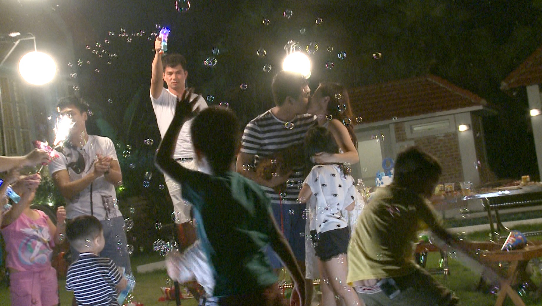 | Bữa tiệc khép lại bằng màn khóa môi và những cái ôm đầy tình cảm của đại gia đình Phan Bo. Khoảnh khắc ngọt ngào của MC Phan Anh và vợ được các bố con trong chương trình phụ họa nhiệt tình. |