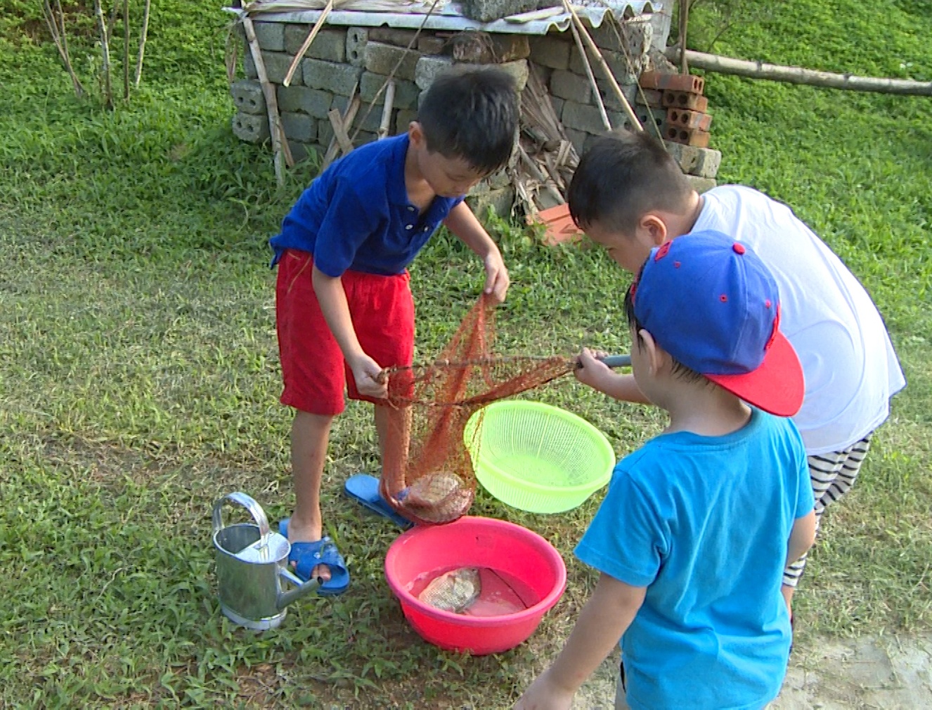 | Cặp đôi Bi - Bờm thích thú hỗ trợ các bố gỡ cá khỏi lưới. |