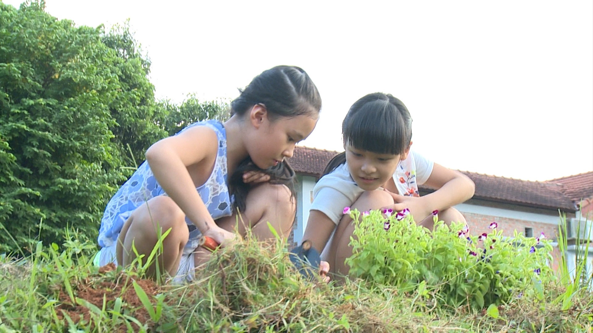 | Trong khi đó, các cô gái mải mê với công việc "trồng cây gây rừng" và có những cuộc chuyện trò vui vẻ. |