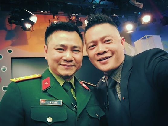 | BTV Quang Minh chụp hình kỷ niệm với diễn viên hài Tự Long - khách mời của Bữa trưa vui vẻ ngày 22/12. |