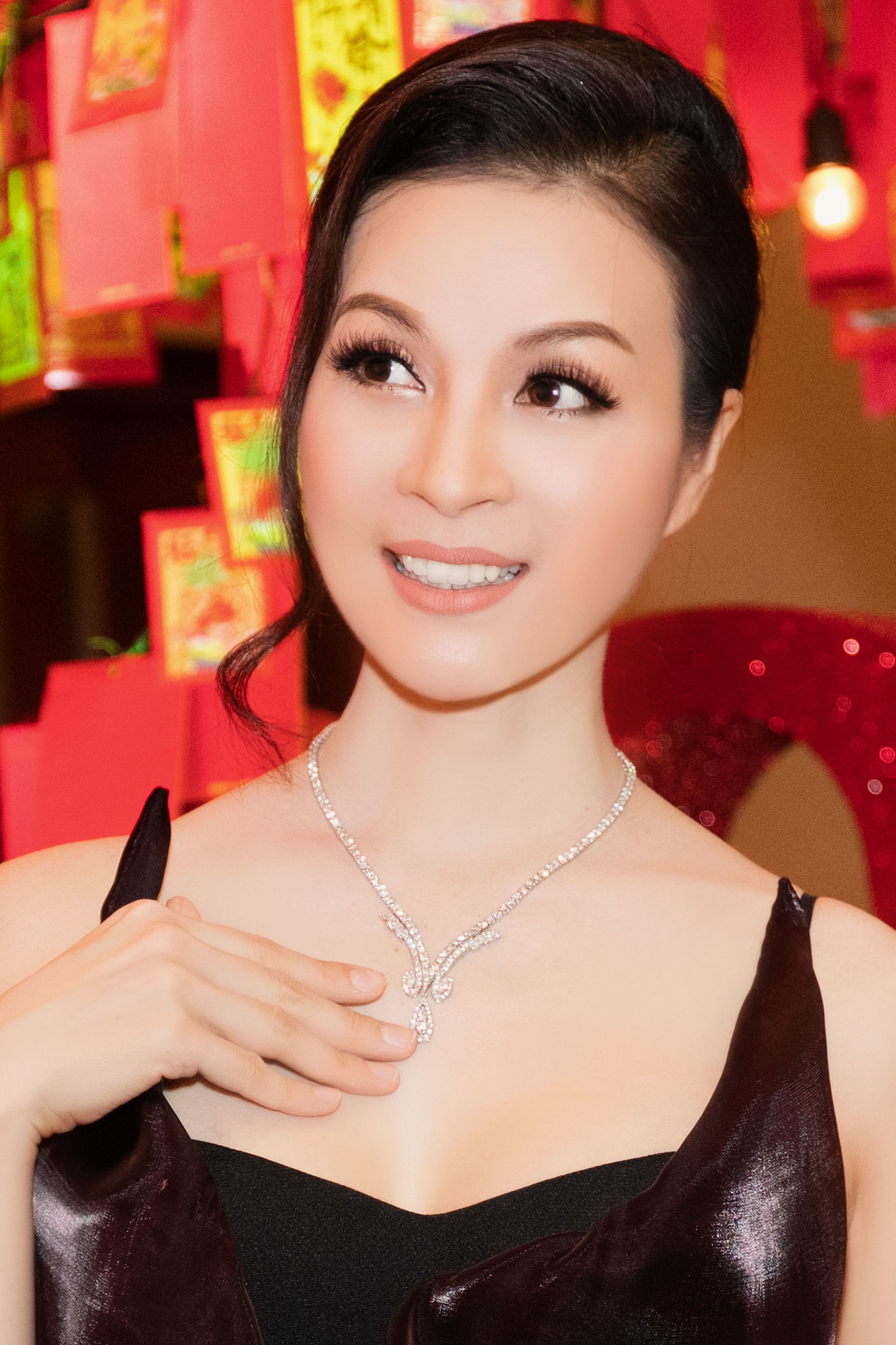 Trang sức kim cương giúp hình ảnh người đẹp 43 tuổi trở nên sang trọng và thanh thoát hơn. Chiếc vòng cổ do nhà thiết kế Ngọc Đoàn, thương hiệu Leman Jewels thiết kế dựa trên ý tưởng tôn vinh cái đẹp thiên nhiên. Những cánh hoa mai điểm trên dây truyền được mô tả bằng kim cương giọt nước. Nhà thiết kế mất hơn một tháng để hoàn thiện sản phẩm theo các tiêu chí chất lượng quốc tế. |