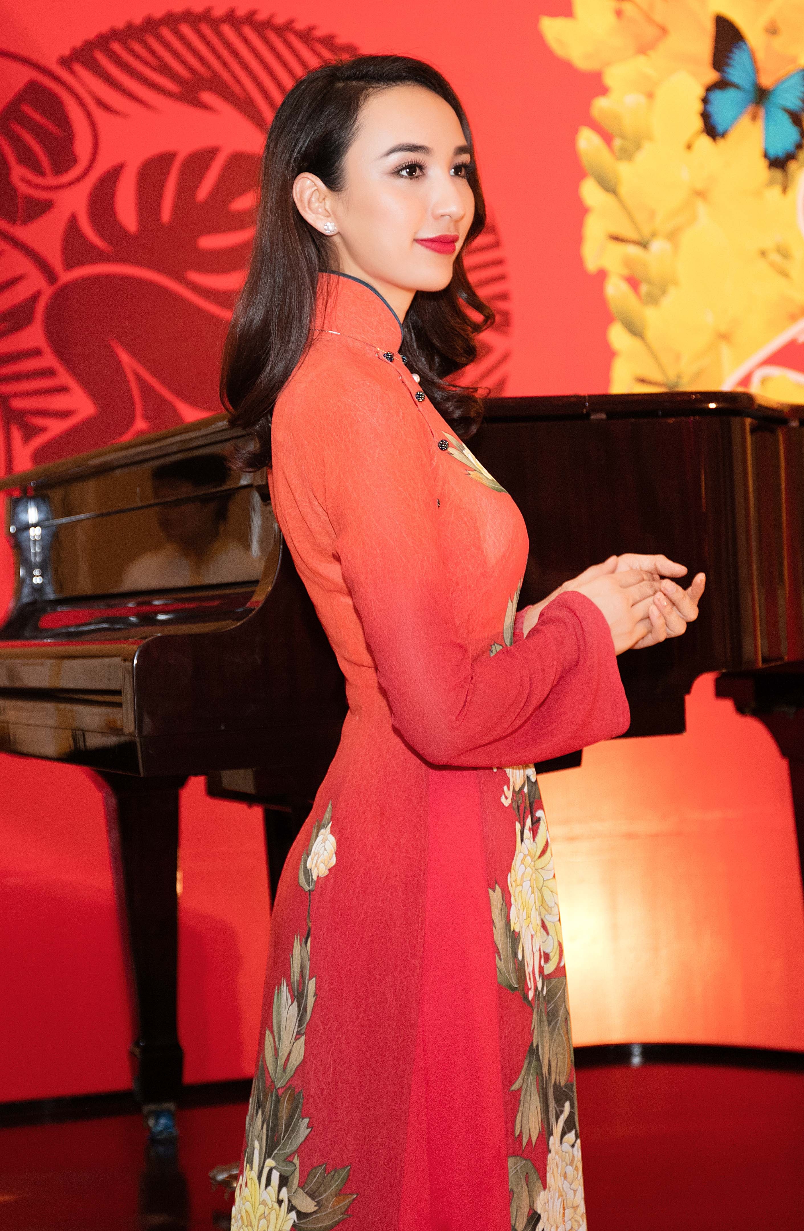 Hoa hậu Ngọc Diễm diện áo dài duyên dáng dự Hội xuân văn nghệ sĩ. |