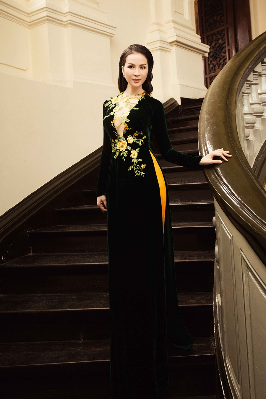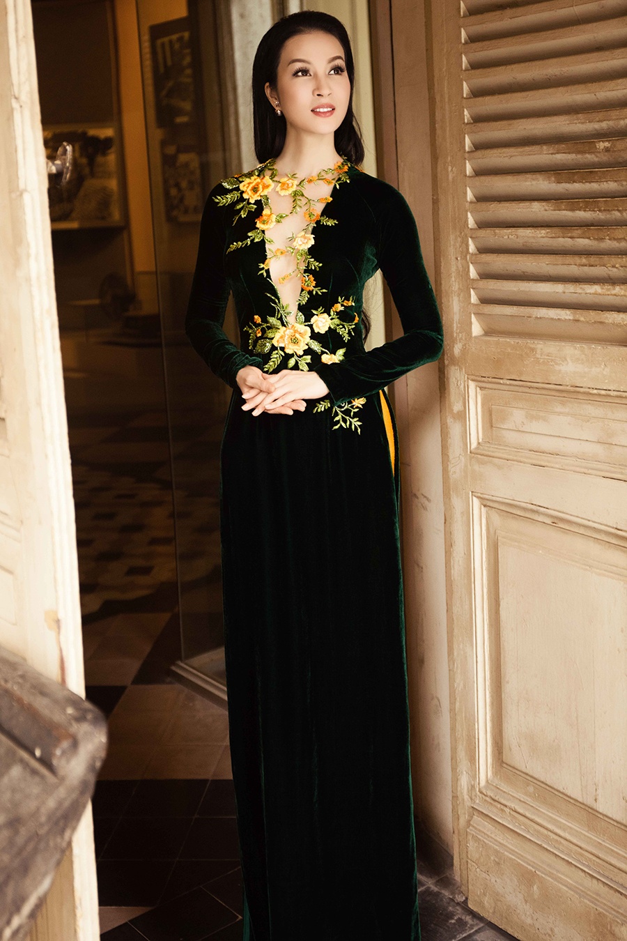 Áo dài truyền thống chổ chữ V sâu điểm hoa mang đến sự mới mẻ, duyên dáng và thanh lịch cho bạn gái trong dịp Tết đến xuân về.