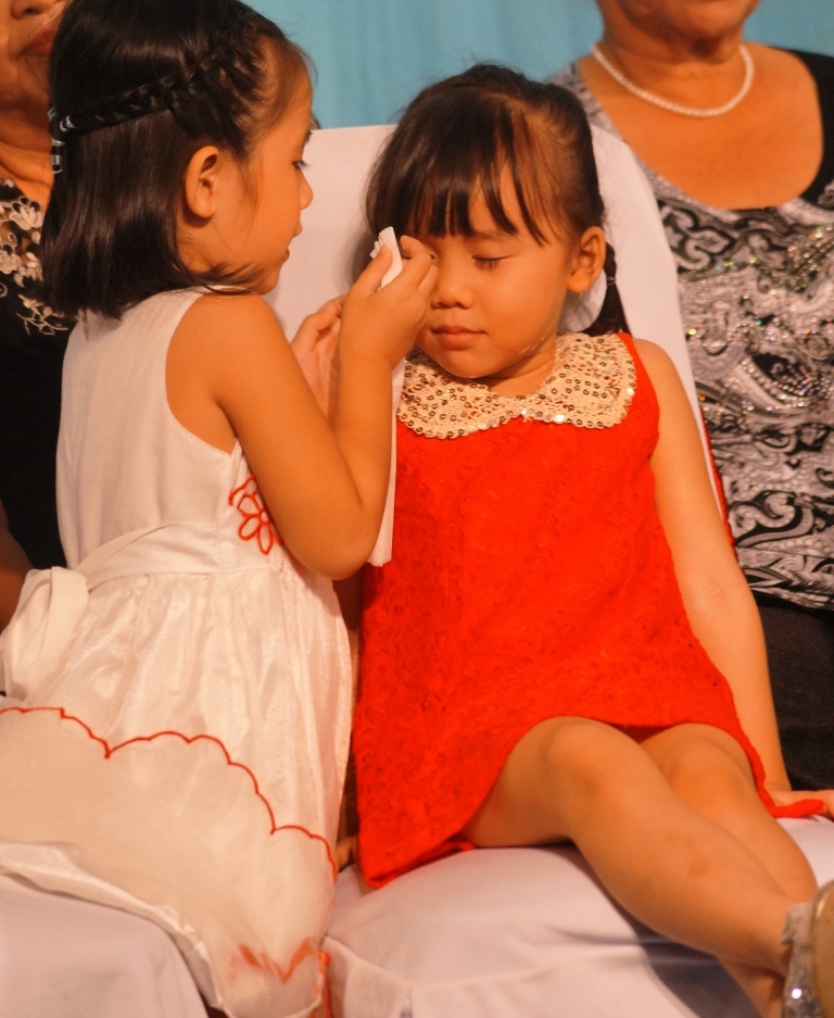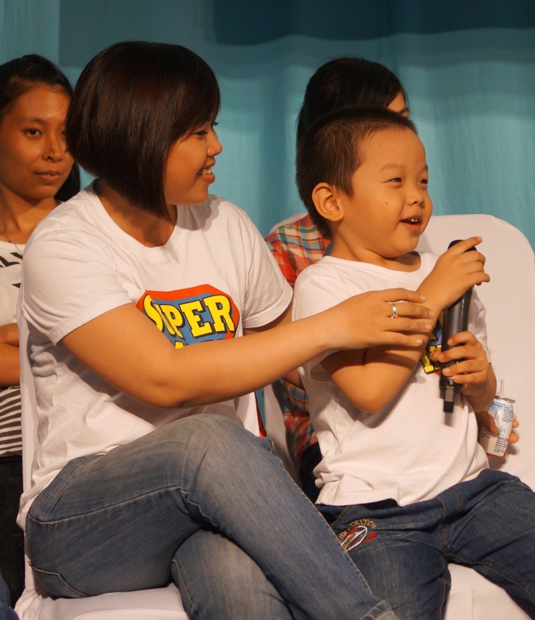 Được bố mẹ nhắc nhở, cậu nhóc Boo tỏ ra khá ngoan ngoãn, không “đột ngột” phát biểu ý kiến nữa mà chăm chú xem đoạn clip. Khác với vẻ hiếu động của Boo, hai cô bạn gái đi cùng là Bống và Úc có vẻ khá thùy mị và thích làm điệu. Trong suốt quá trình ghi hình, có thể dễ dàng bắt gặp hình ảnh 2 cô nàng đang giả vờ…trang điểm cho nhau.