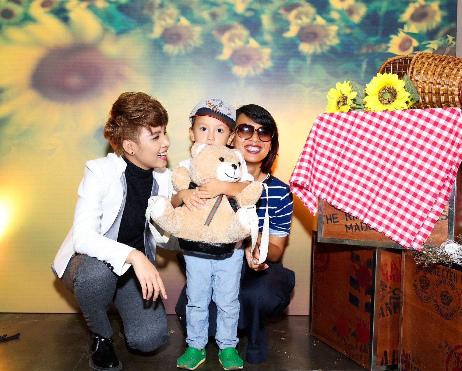MC chương trình Những kẻ lắm lời diện trang phục giản dị cùng bé trai 4 tuổi đáng yêu đến chúc mừng giọng ca "Mơ" ra mắt sản phẩm mới chiều 4/1, tại TP HCM.