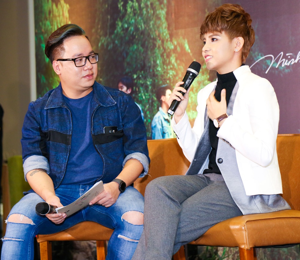 | Nhạc sĩ Huy Tuấn dành nhiều lời khen cho sáng tác mới của Vũ Cát Tường. Anh đùa: "Làm việc với Tường căng thẳng lắm vì cô gái này rất khó tính, cầu toàn". |